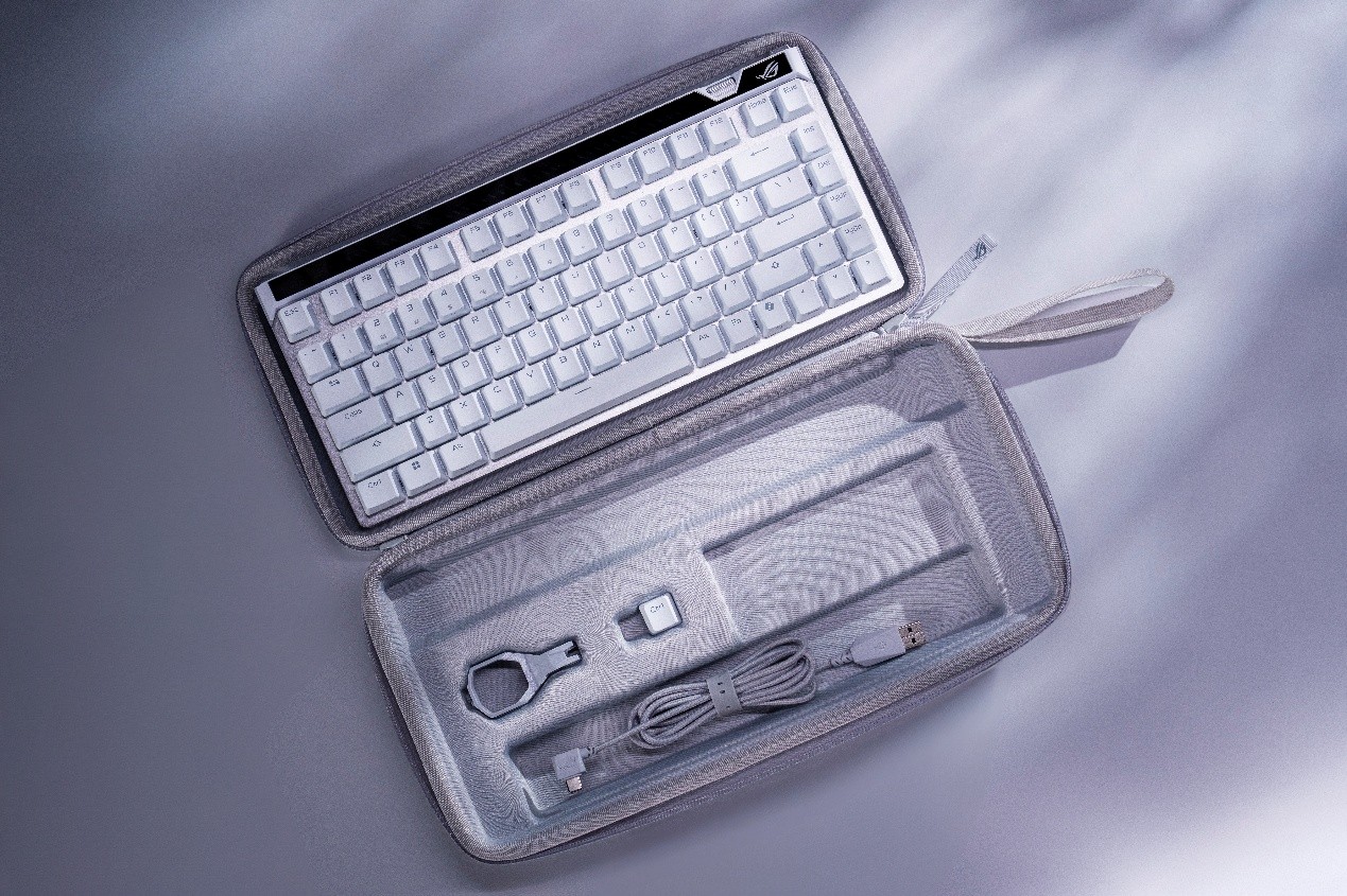 在磁轴设计方面,全新ROG HFX V2X磁轴采用火山口轴心设计,同时兼容十字轴心键帽,内部配备X形稳定器,确保每次敲击都无晃动,让玩家在激烈的游戏对战中能够稳定发挥。底壳选用POM材质,带来更加沉稳的触底声音表现,进一步提升键盘的使用质感。在内部结构上,采用六层消音结构,有效减少敲击时产生的噪音,为玩家营造出柔和的手感和安静的游戏环境。同时,引入触发与RT精度调节滚轮,保留多功能控制按钮、smartBar触控条以及RT功能开关,方便玩家进行各种操作设置。搭配L形USB Type-C®接口,便于线缆管理,轻松打造整洁的游戏桌面。此外,还附赠定制款便携保护盒,方便玩家携带外出。