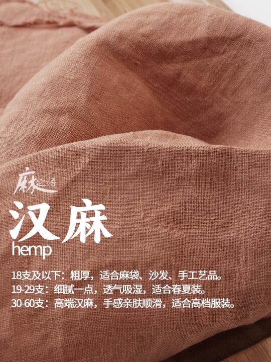 汉麻纤维最短,摸起来最细腻、不扎人,一般用在高端面料。50%汉麻+50%亚麻的混纺布,贵,但透气舒适,适合贴身穿。