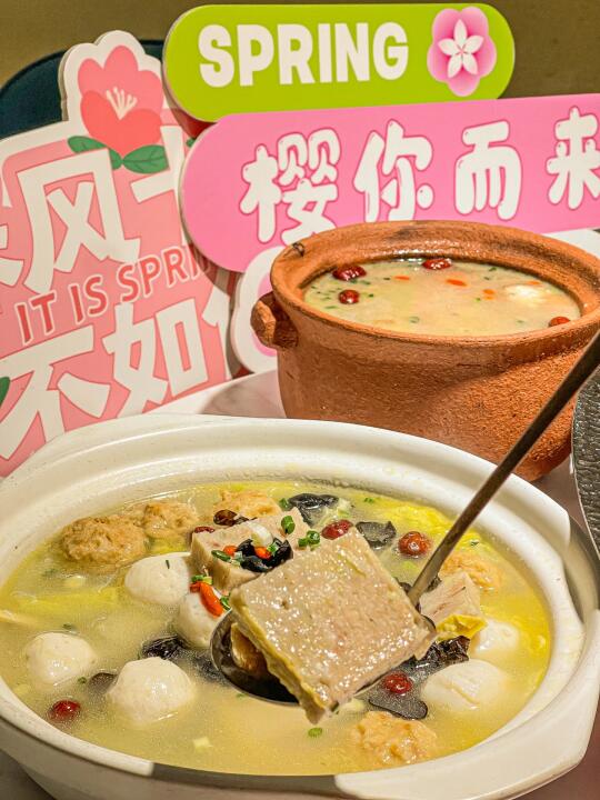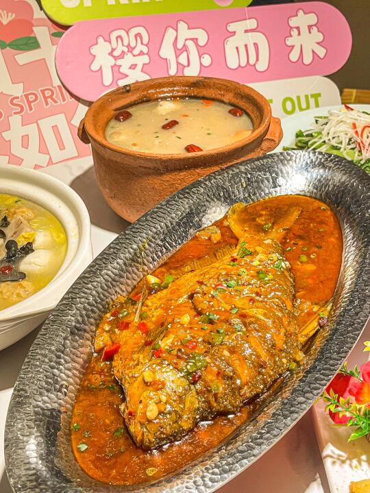 三月的武汉是樱花盛开的季节 来武汉旅游一边欣赏浪漫樱花🌸 一边品尝地道湖北菜 当然不能错过这家老城故事 地理位置绝佳 就在黄鹤楼附近 吃完美食还可以步行登黄鹤楼 旅行路线给安排明明白白 💕 菜品 樱花季推出的 樱花饮品和发糕 粉粉的颜值太高啦 味道也很赞 满江红武昌鱼 鱼肉鲜嫩 鱼肉烧的非常入味 汤汁拌饭我可以吃一碗 👍 黄陂三鲜 湖北特色菜端上来敲大一盆 整盘非常丰盛 鱼丸Q弹又鲜美 还有特色的肉糕 肉丸 娃娃菜打底 汤汁鲜美 洪湖莲藕汤 湖北特色的藕汤 汤汁浓郁粉糯的莲藕 几乎是每桌bi点
