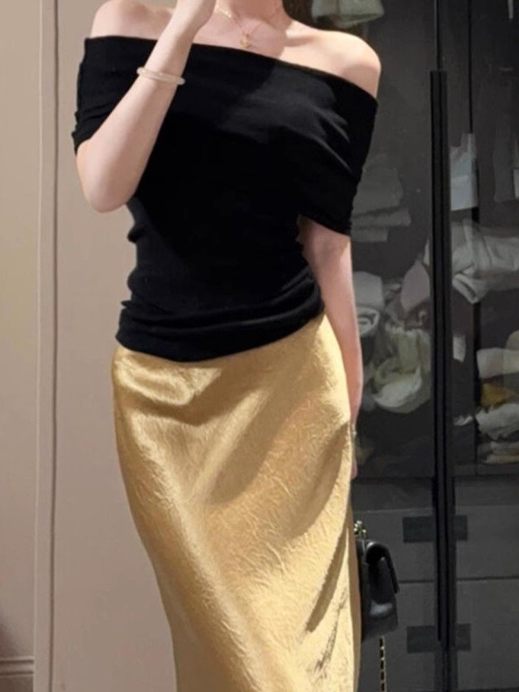 小个子黑色一字肩修身针织冰丝t恤女短袖夏