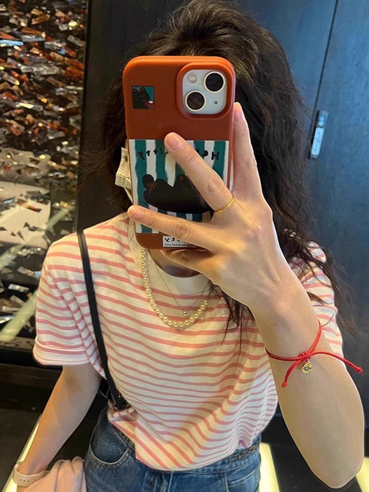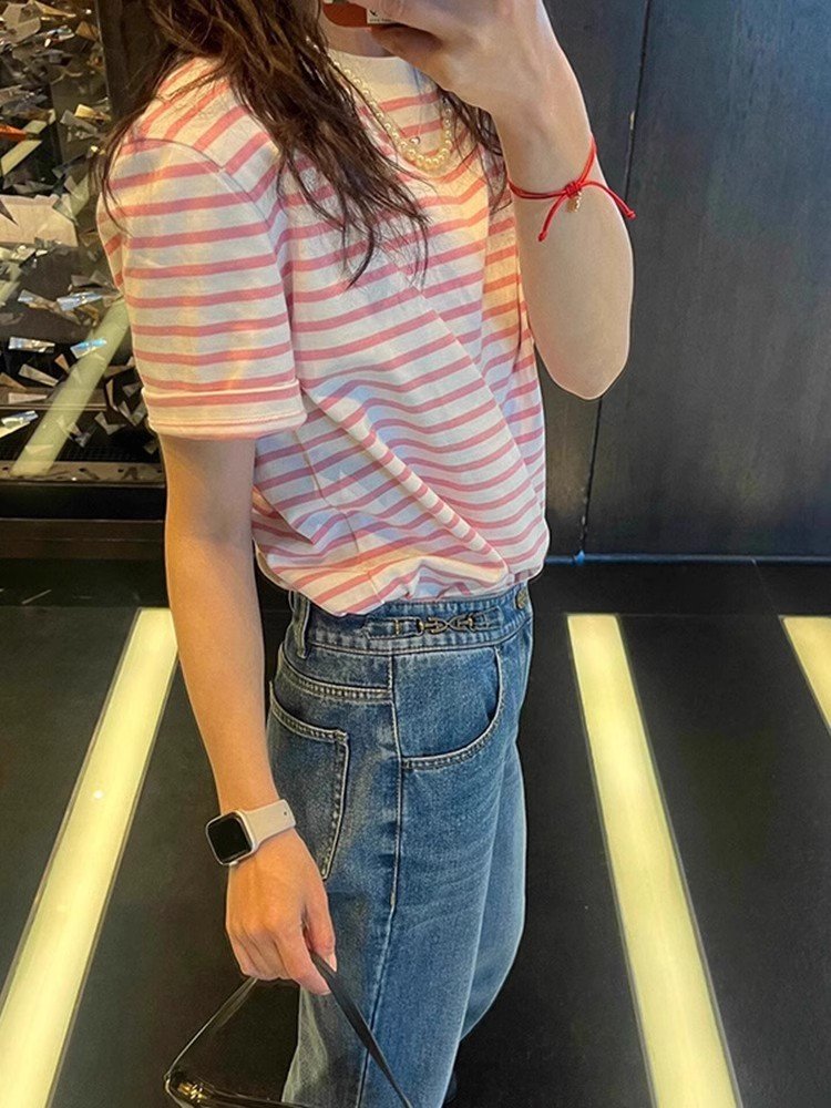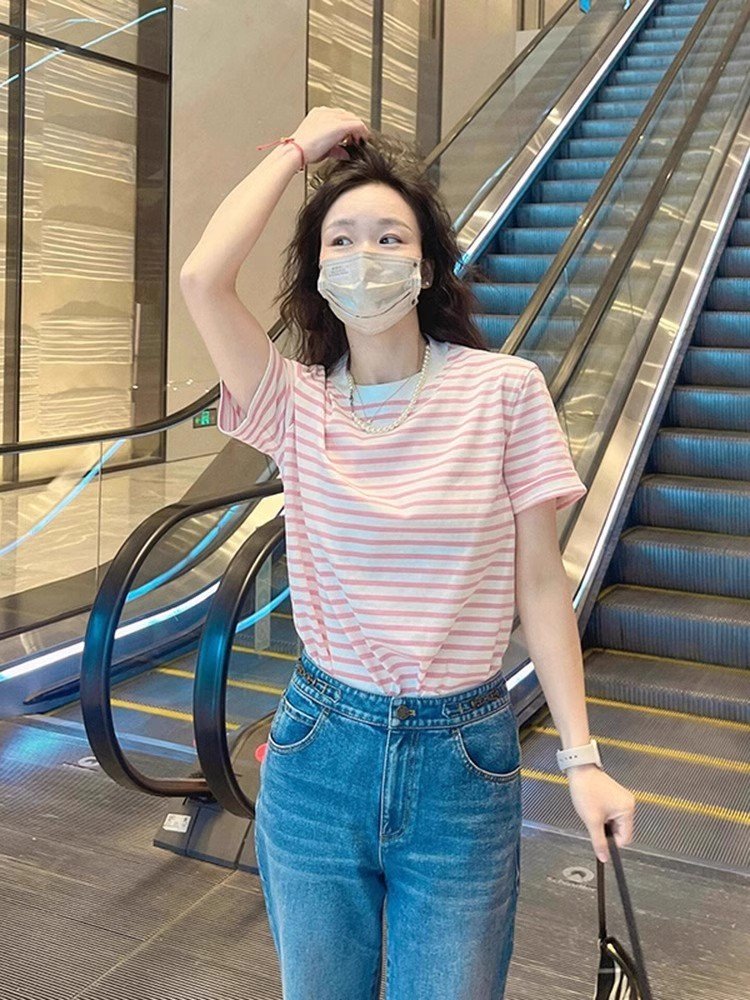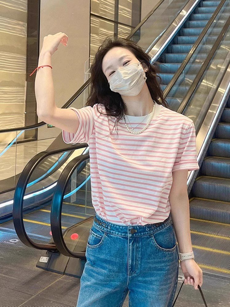2025新款粉色条纹短袖正肩T恤女小香风
