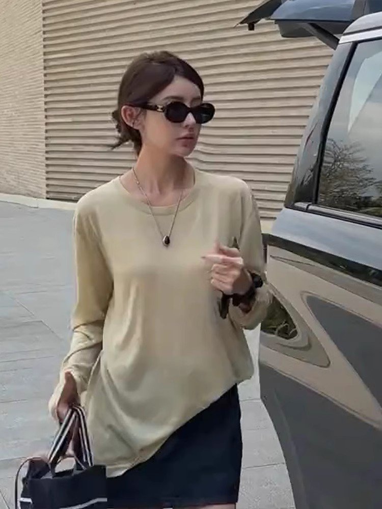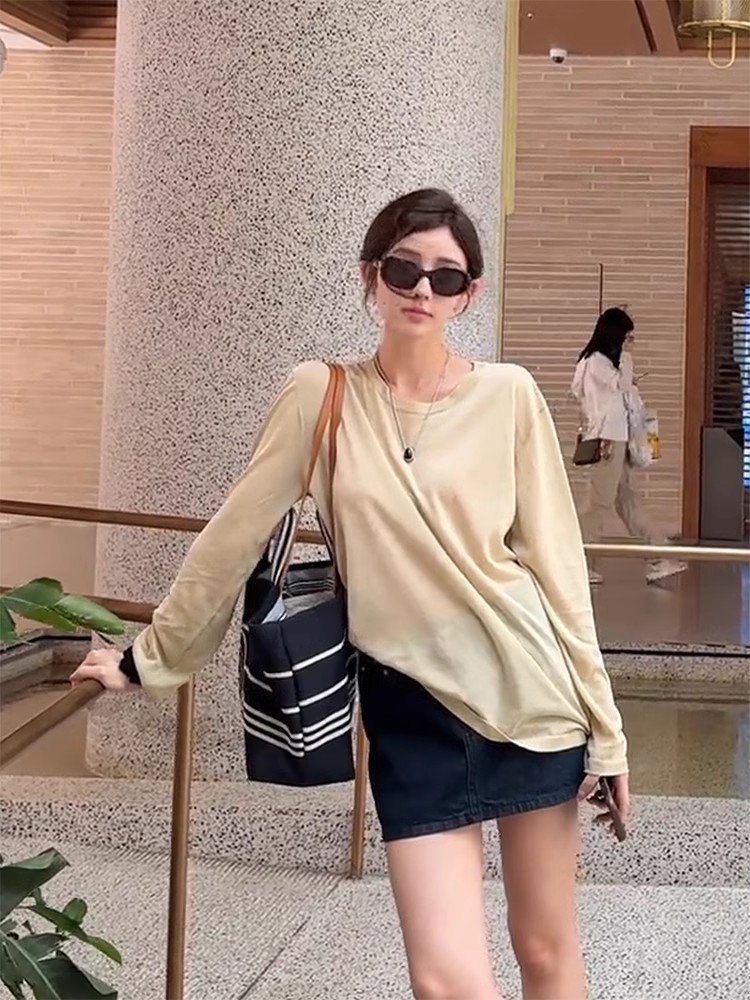卡其色单穿长袖正肩t恤女春秋独特超好看打