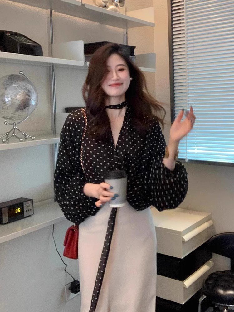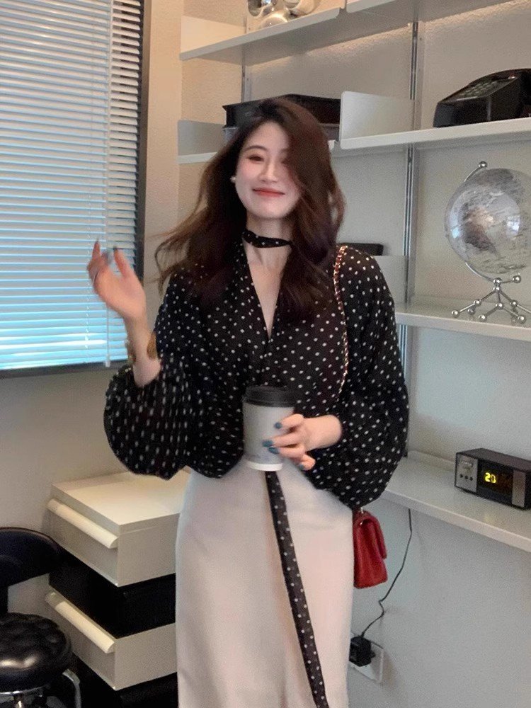 法式气质黑色v领波点长袖衬衫女早春轻奢洋