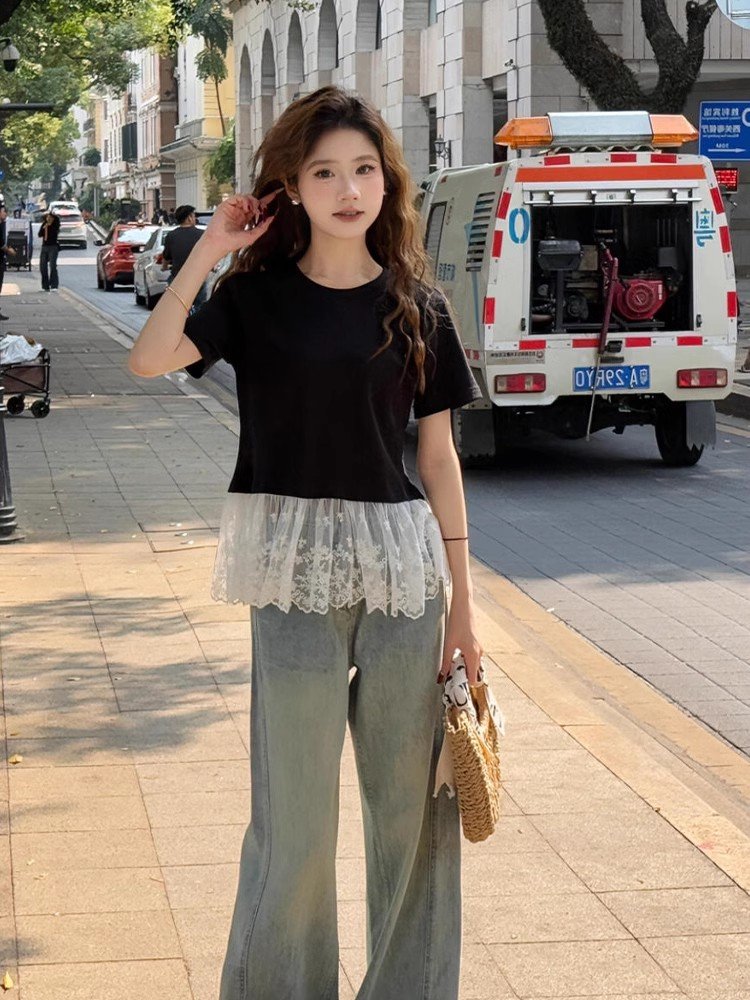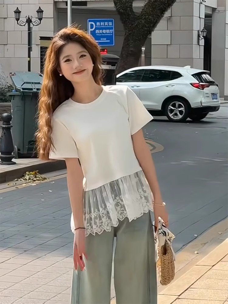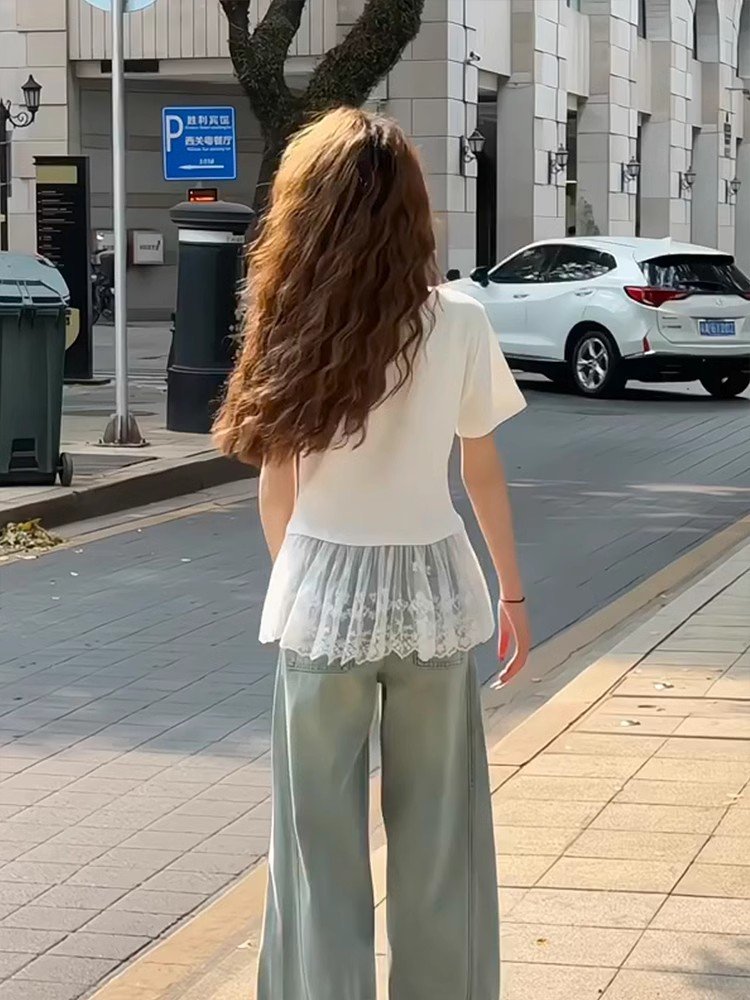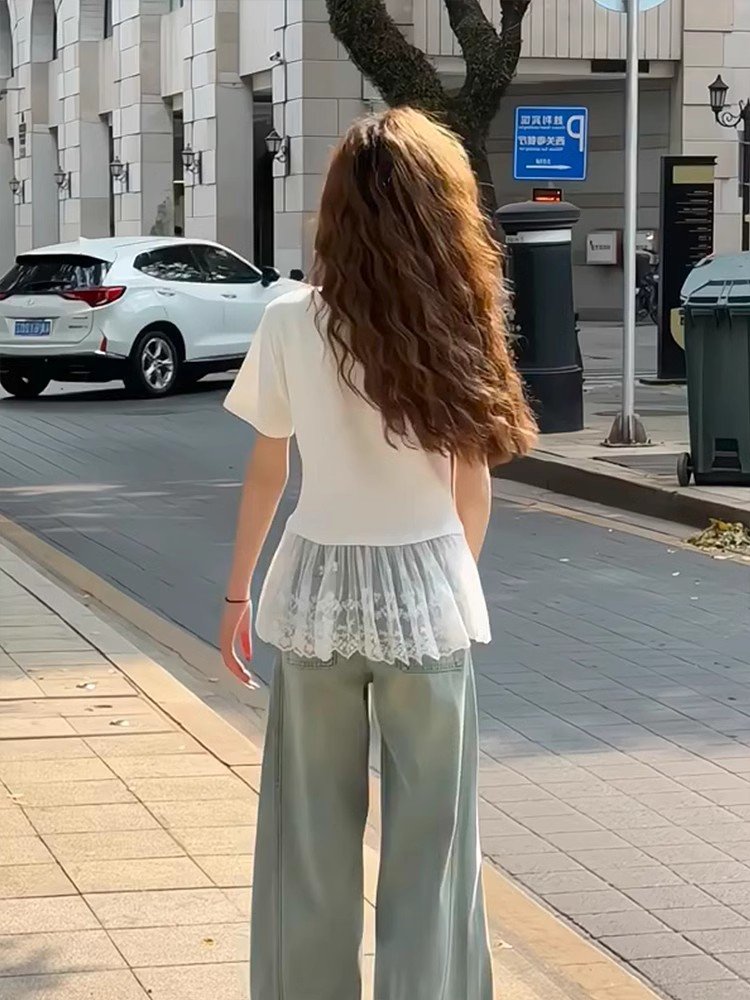 美式复古白色短袖正肩女t恤夏季设计感蕾丝