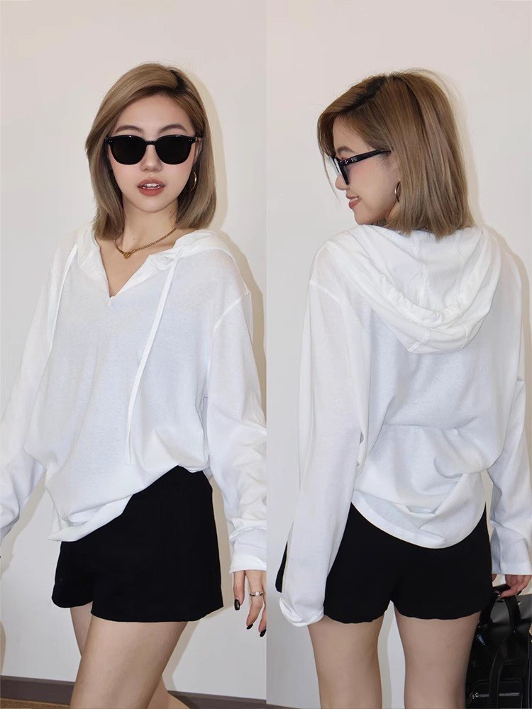 小个子白色连帽正肩外搭罩衫长袖t恤女春秋