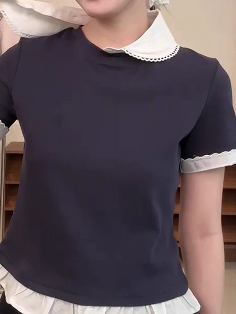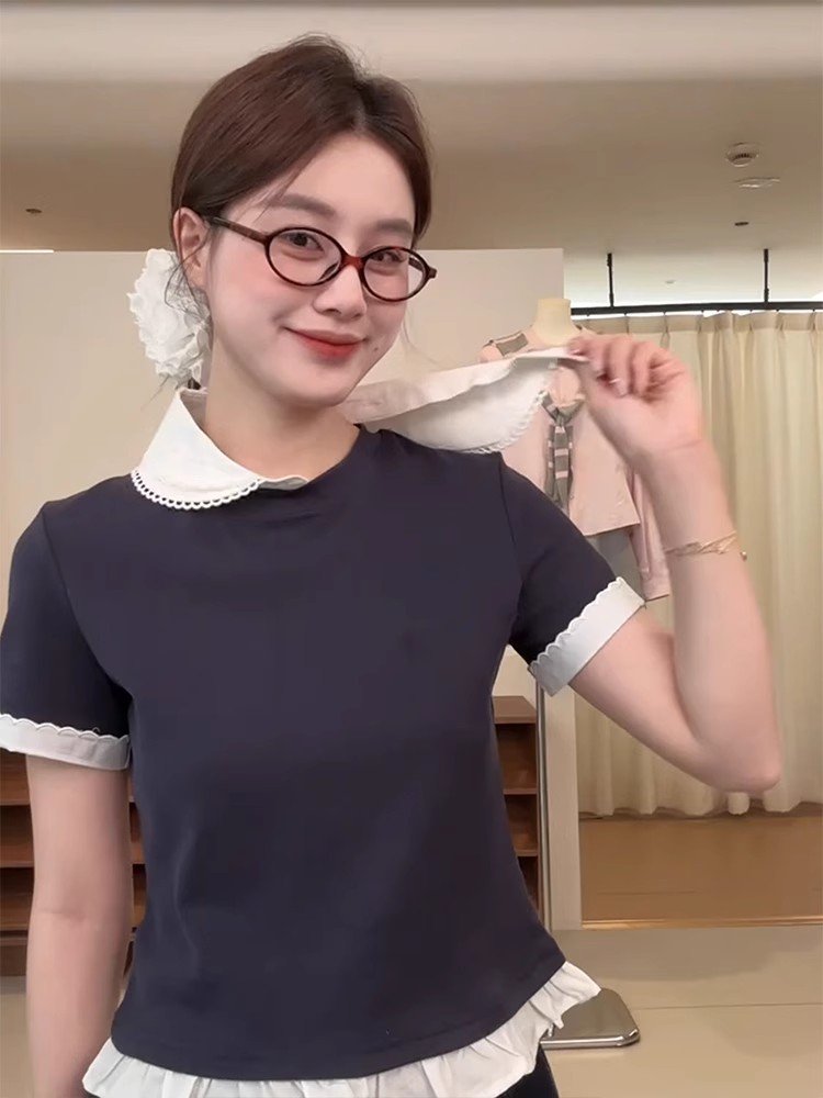 韩系藏青色娃娃领正肩短袖t恤女夏季设计感
