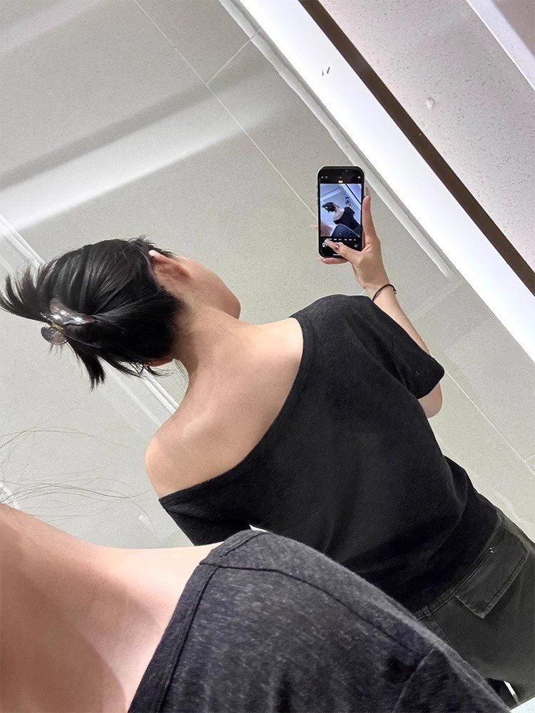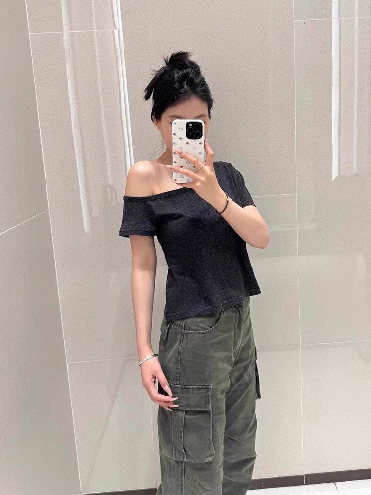 一字领灰色斜肩短袖纯棉t恤设计感宽松短款