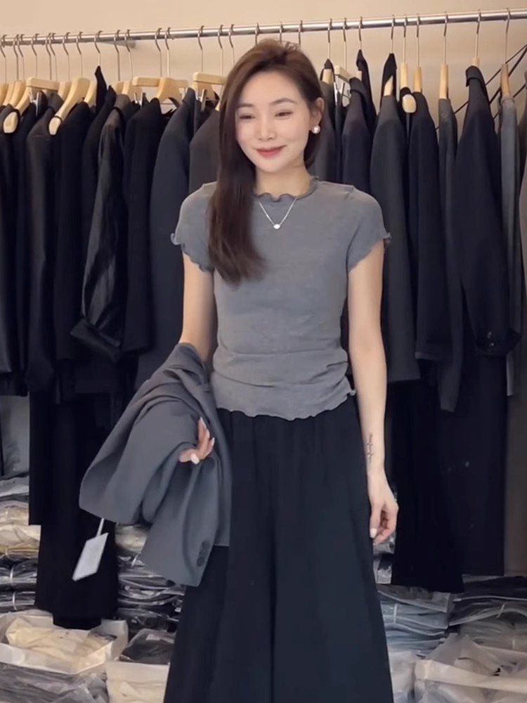 小个子灰色木耳边短款修身短袖t恤女夏季设