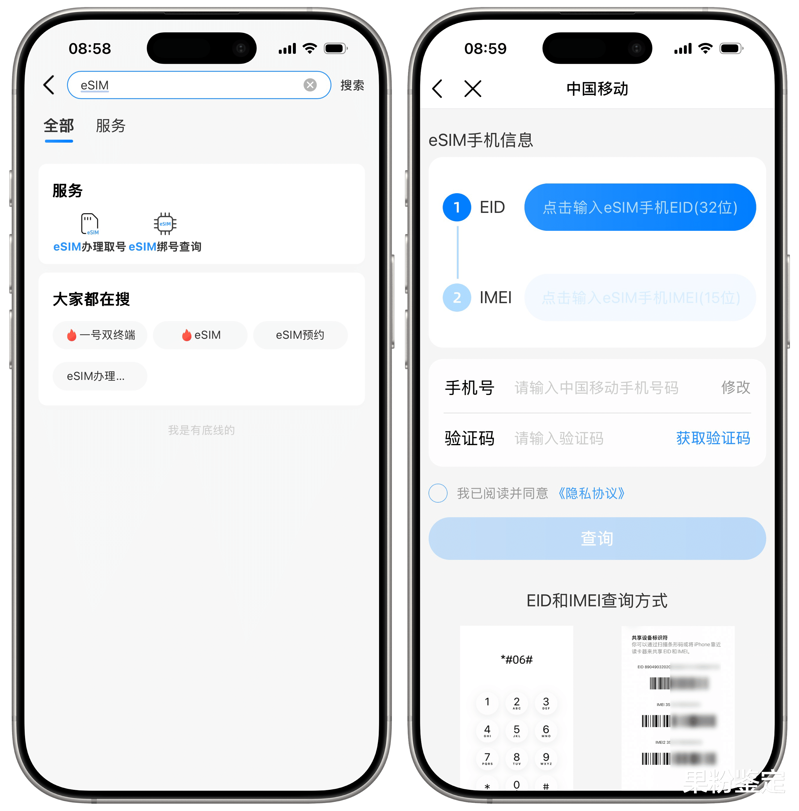 接着填写手机的IMEI(终端串号)和EID(eSIM 芯片序列号),查询设备的 IMEI 和 EID,在手机拨打界面输入“*#06#”,就能看到 IMEI 和 EID 以及对应的条码。)
