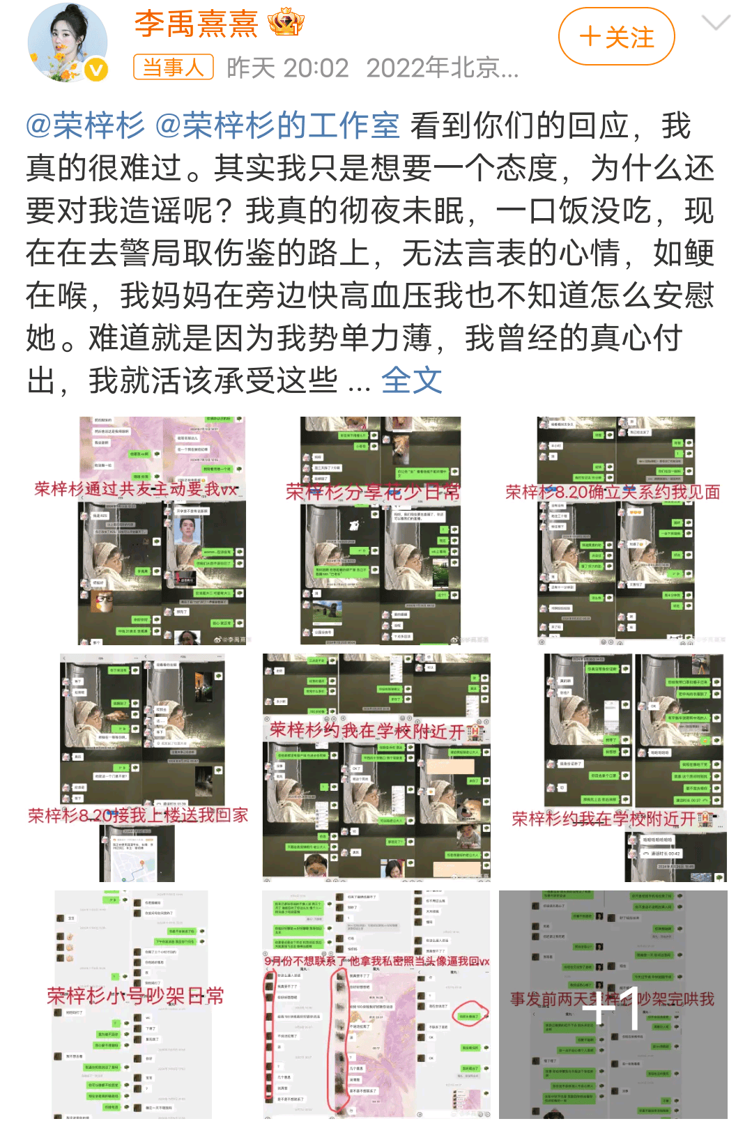 李禹熹突然在社交平台上晒出和荣梓杉的聊天记录,直接把两人的感情纠葛公之于众。这可不得了,荣梓杉工作室赶紧站出来回应,说两人根本就不是恋爱关系,李禹熹是在造谣,还表示要走法律程序。可是,李禹熹也不是吃素的,她拿出的聊天记录里,有荣梓杉主动索要微信、约会、承认恋情这些实锤内容,甚至还有荣梓杉用她的私密照当头像,逼着她回复消息的操作,这尺度简直了。
