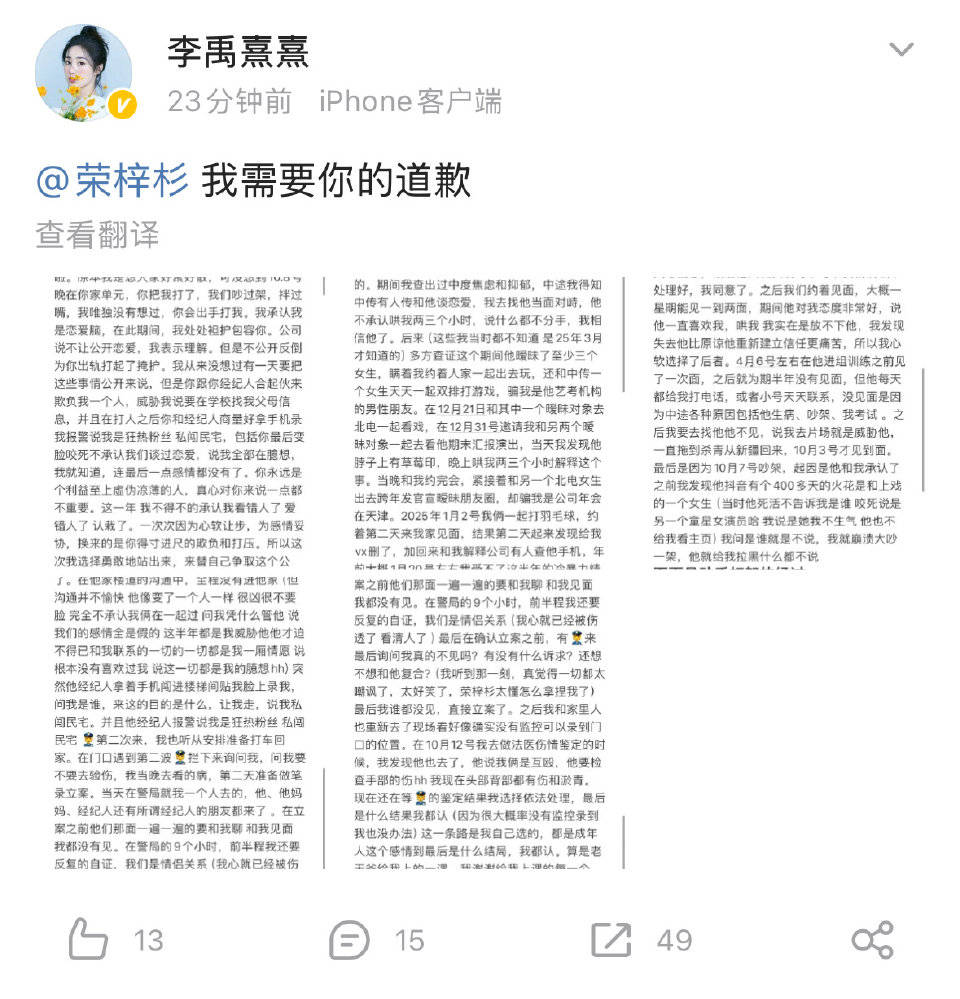 除了这些让人哭笑不得的段子,事情还远没那么简单。李禹熹不仅指责荣梓杉在恋爱期间出轨,还说他在吵架时满口脏话,甚至在她试图结束联系时,用私密照当头像来威胁她,这种行为简直让人无语。而且,据她描述,自己还曾因为荣梓杉的冷暴力确诊中度焦虑和抑郁。这已经不仅仅是感情纠纷这么简单了,严重侵犯了他人的人格尊严和隐私权利,是不折不扣的违法行为。