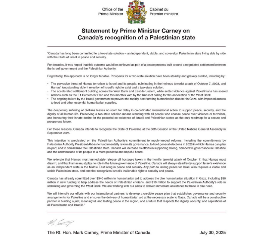 继马克龙之后,加拿大总理卡尼发布声明,承认巴勒斯坦国。他表示,“加拿大长期以来一直致力于两国解决方案——一个独立、可行、拥有主权的巴勒斯坦国,与以色列国和平安全地毗邻共存”。