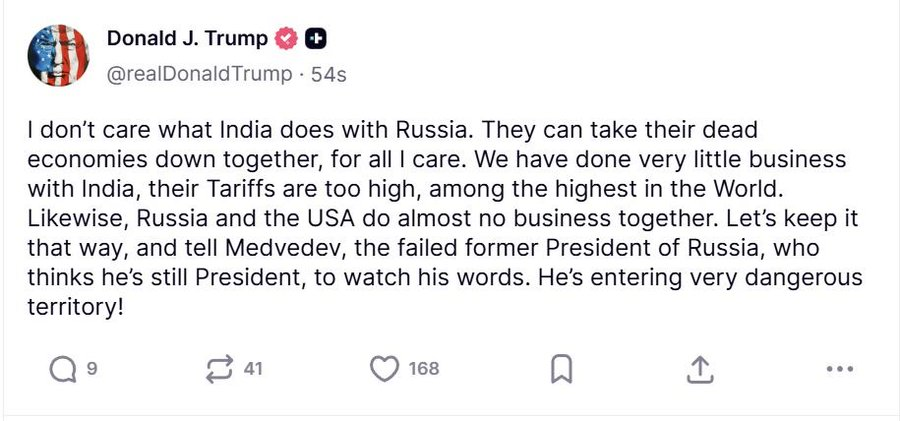 “我不在乎印度如何对待俄罗斯。他们可以一起摧毁各自已然衰败的经济,我才不在乎。 我们与印度几乎没有做生意,他们的关税太高,是世界上最高的。同样,俄罗斯和美国几乎没有做生意。 让我们保持这种状态,并告诉梅德韦杰夫,这位失败的俄罗斯前总统,他自认为仍然是总统,要谨言慎行。 他正在进入非常危险的境地”!