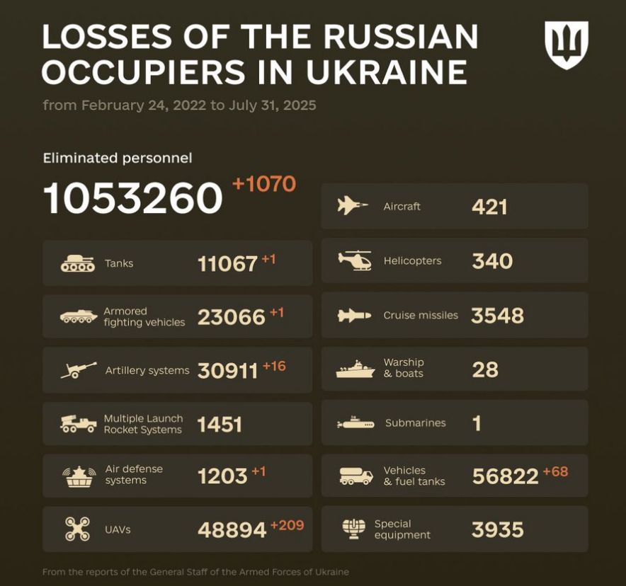 乌总参公布的昨日战果,杀敌(毙+伤)1070人,俄军总伤亡达到了1053260。