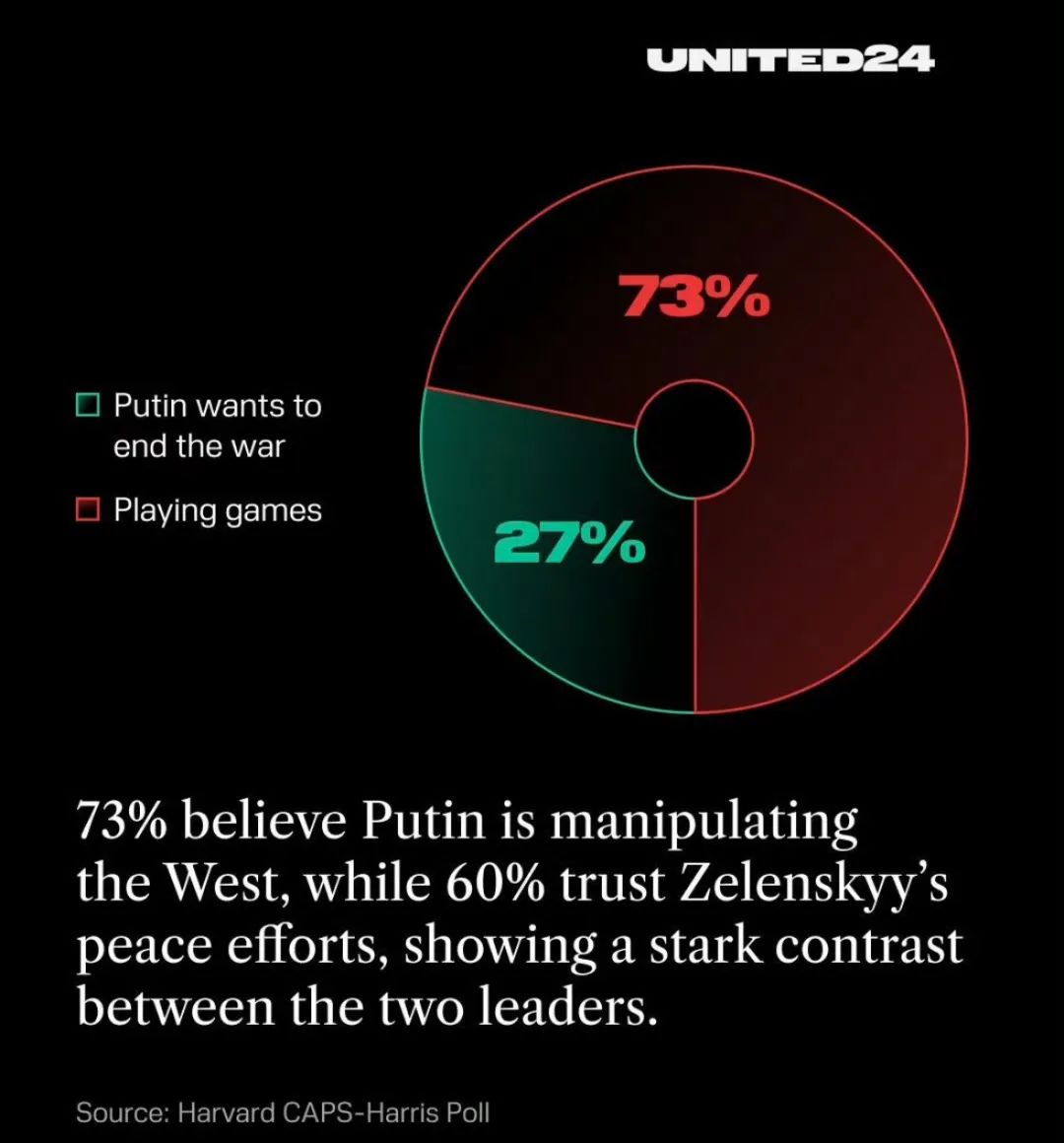 此外,有73%的人认为普京在操纵西方,而60%的人信任泽连斯基的和平努力。