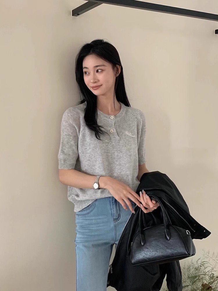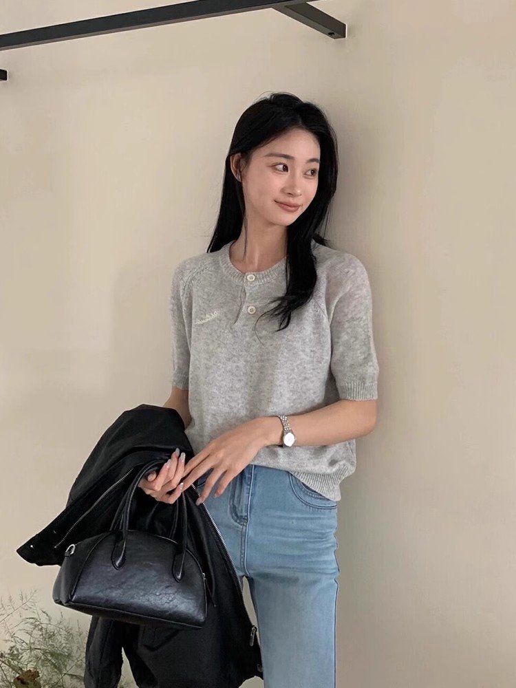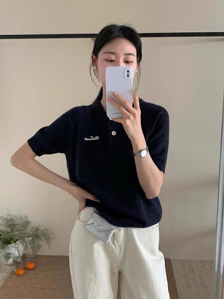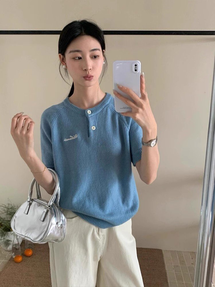 韩系设计感蓝色针织冰丝短袖正肩t恤女夏季