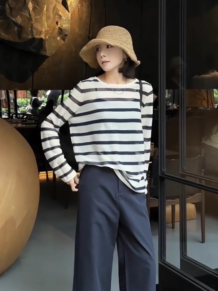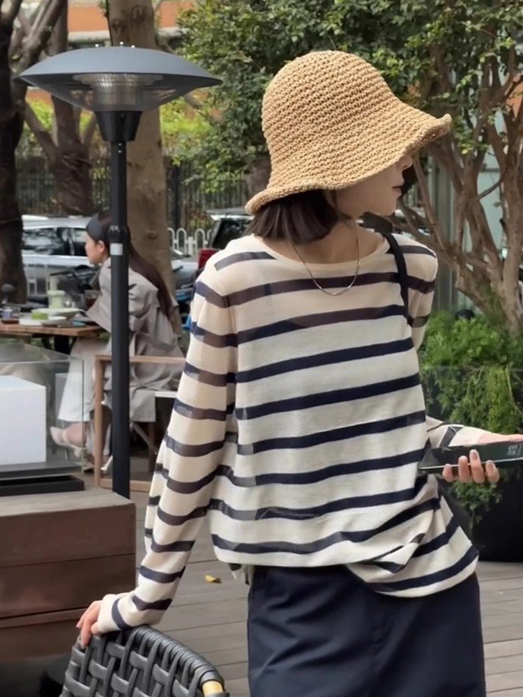 小个子撞色条纹薄款外搭针织衫冰丝罩衫上衣