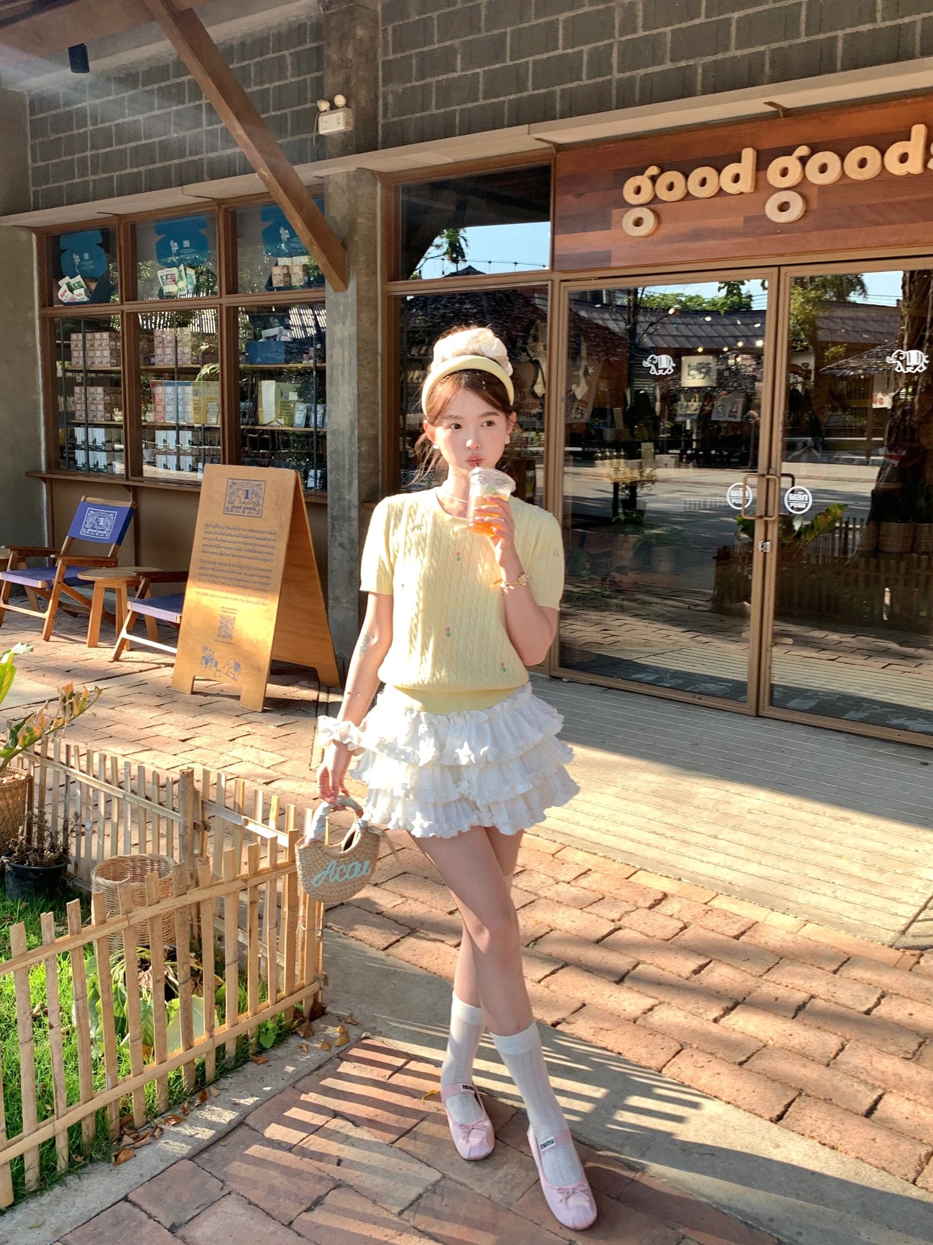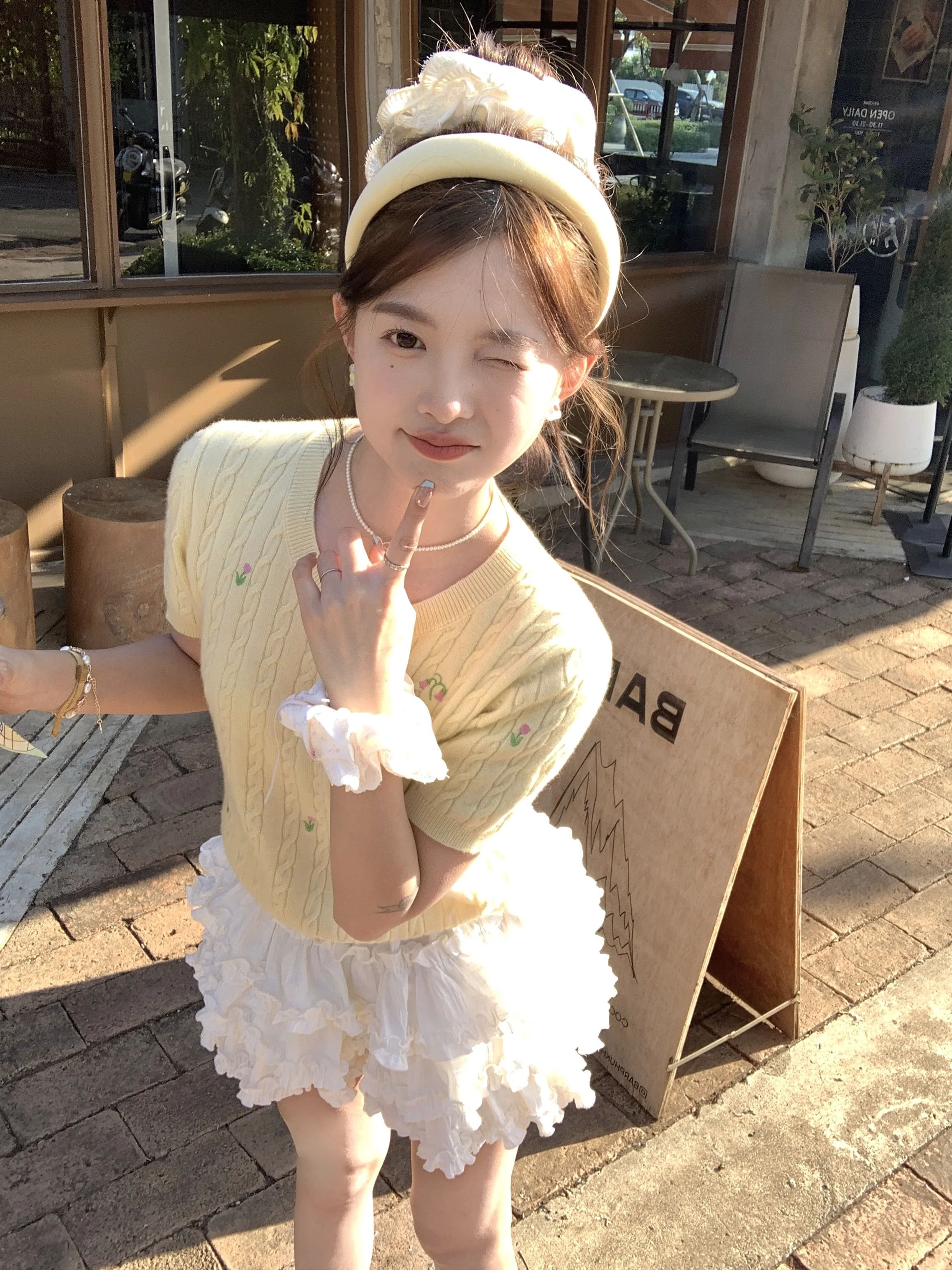 韩系黄色刺绣麻花针织冰丝短袖正肩t恤小个