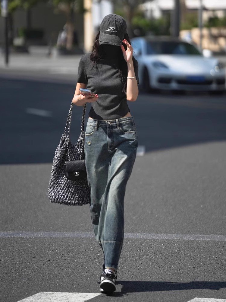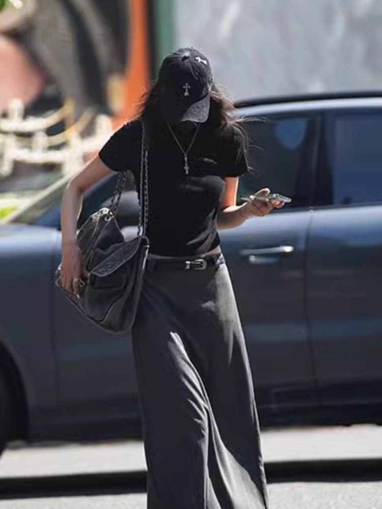 辣妹灰色不规则针织短袖正肩t恤女夏夏季小