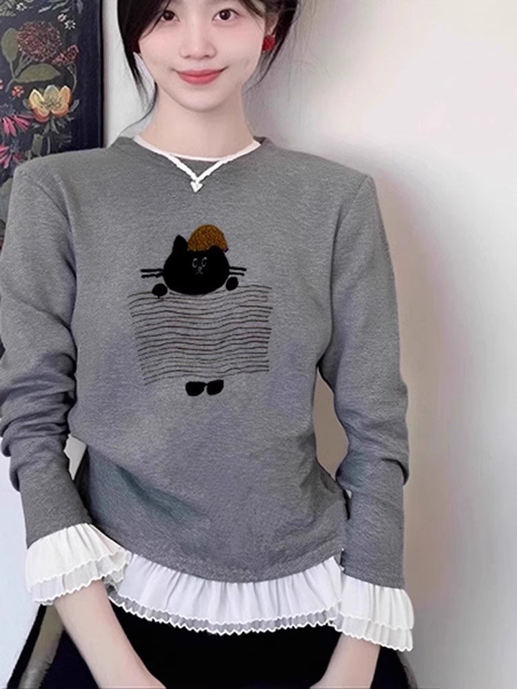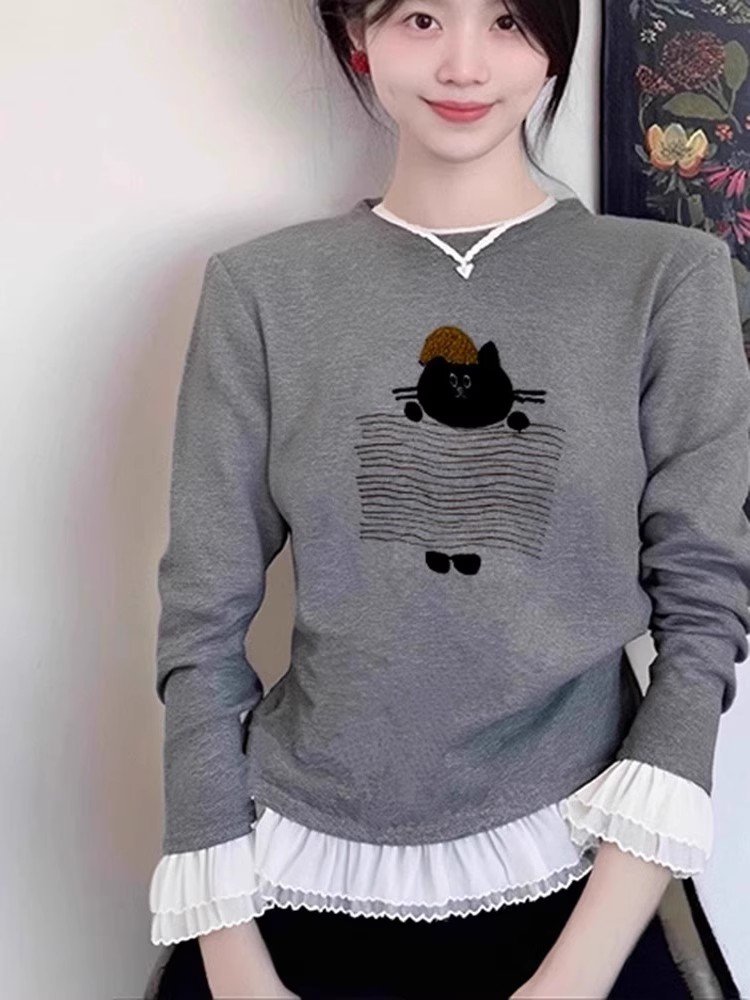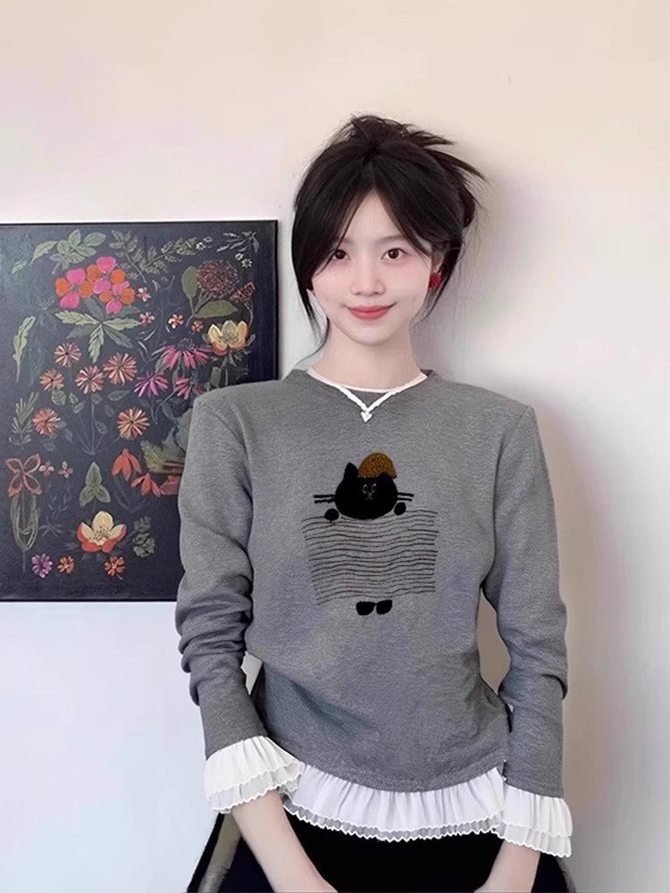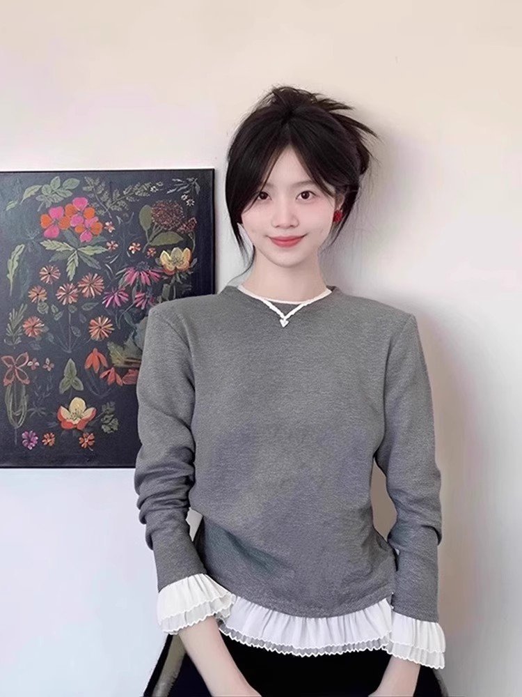 美式复古灰色长袖正肩t恤女春秋小众独特别