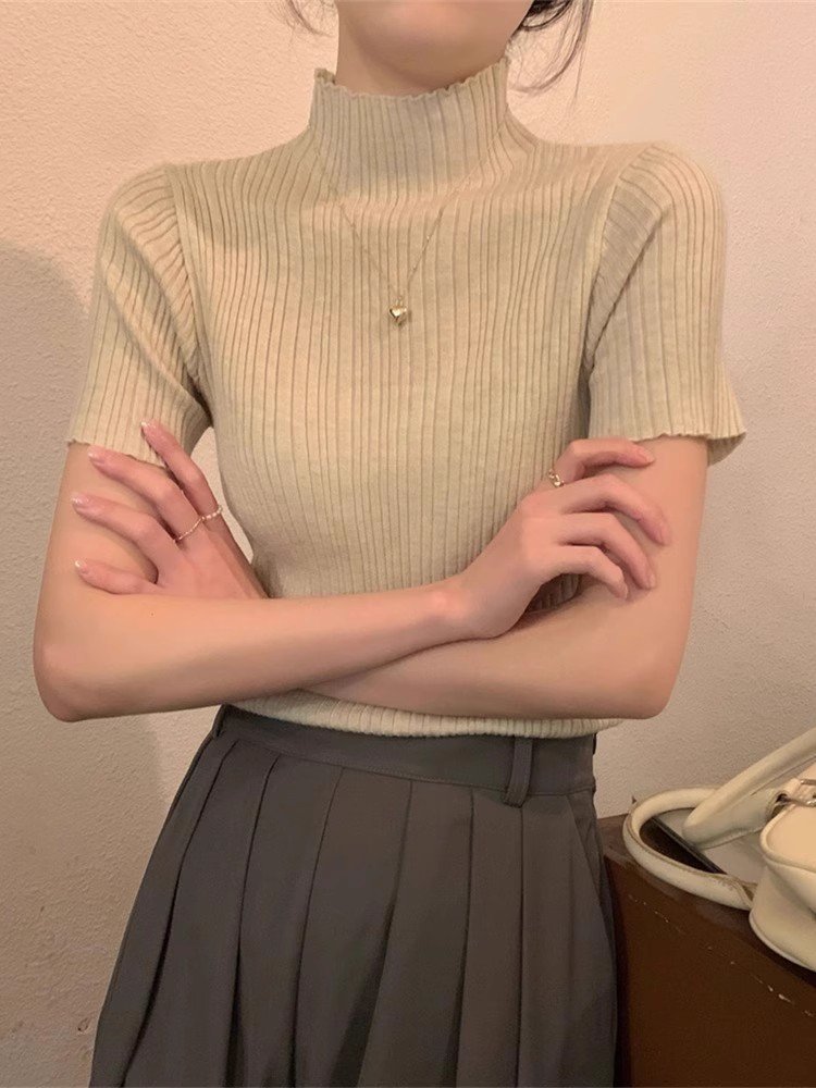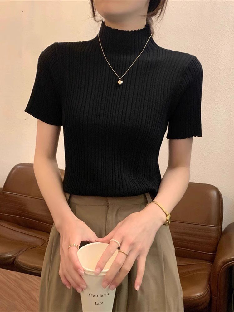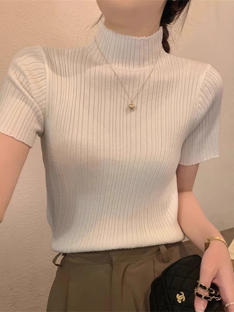 韩系白色半高领正肩短袖t恤女夏季小个子冰