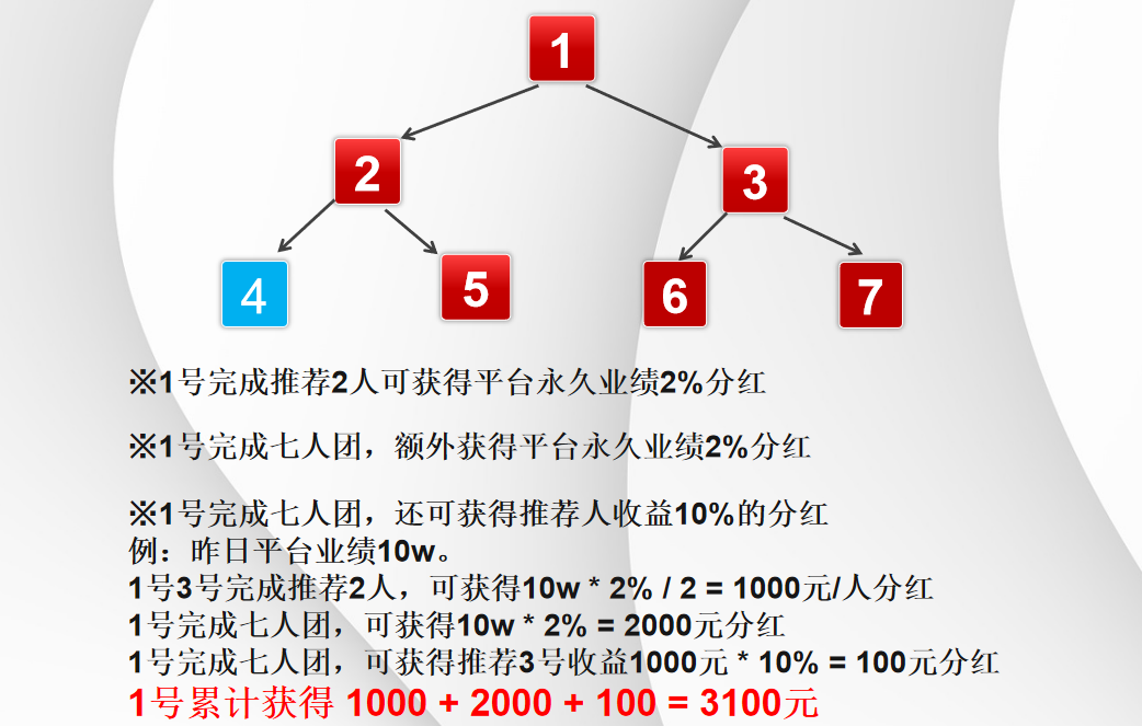 👉 第一层:两人成组 = 基础分红(永久)推荐 2 人即可分平台总业绩 2%,按达标人数均分。比如平台单日业绩 10 万,2 人达标,老板就能分 1000 元 / 天,相当于 “平台赚钱,你躺着分”。