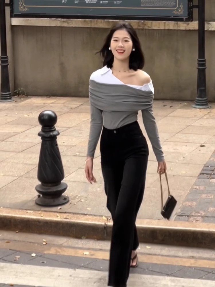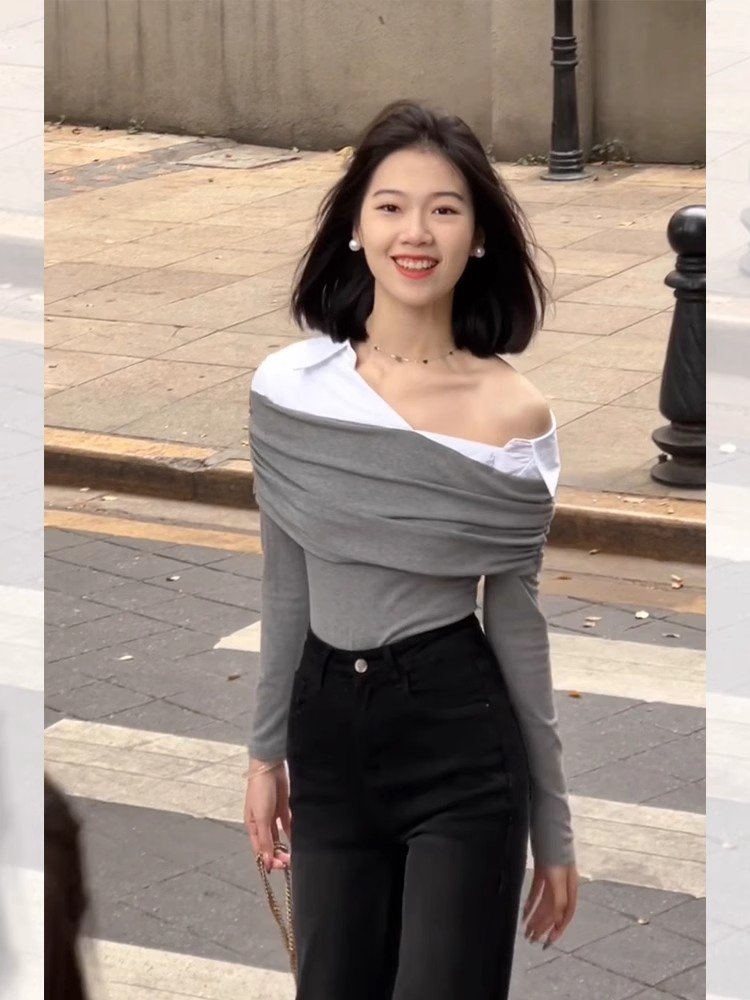 韩系灰色假两件一字肩长袖t恤女春季秋高级