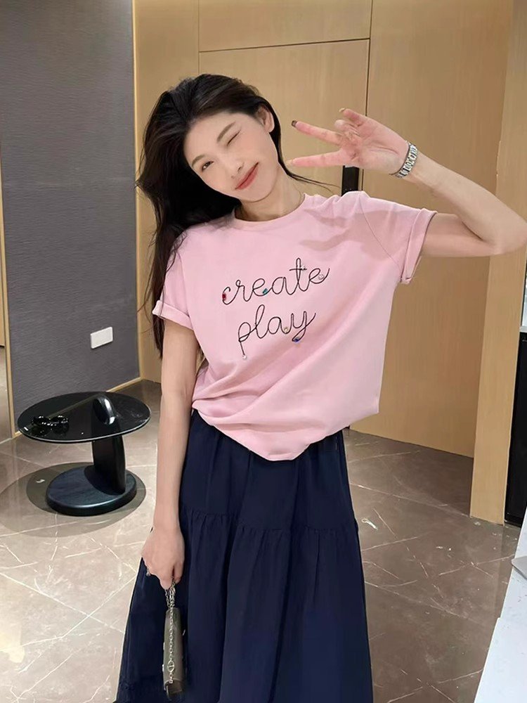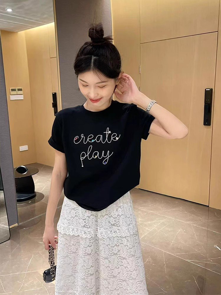 设计感灰色刺绣短袖正肩t恤女夏季独特别致