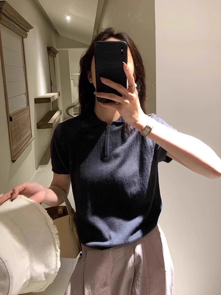 韩系灰色半拉链polo领短袖正肩t恤女夏