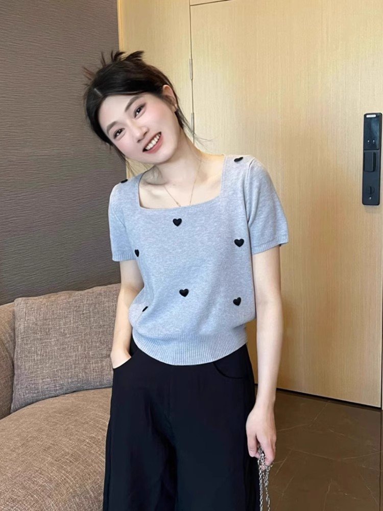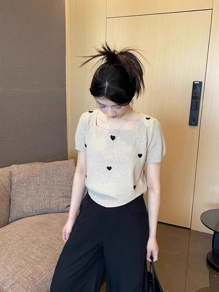 法式燕麦色爱心刺绣方领短袖正肩t恤女夏季