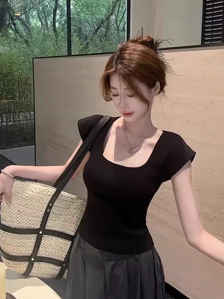 韩系灰色方领飞飞袖短袖t恤女夏季小个子冰