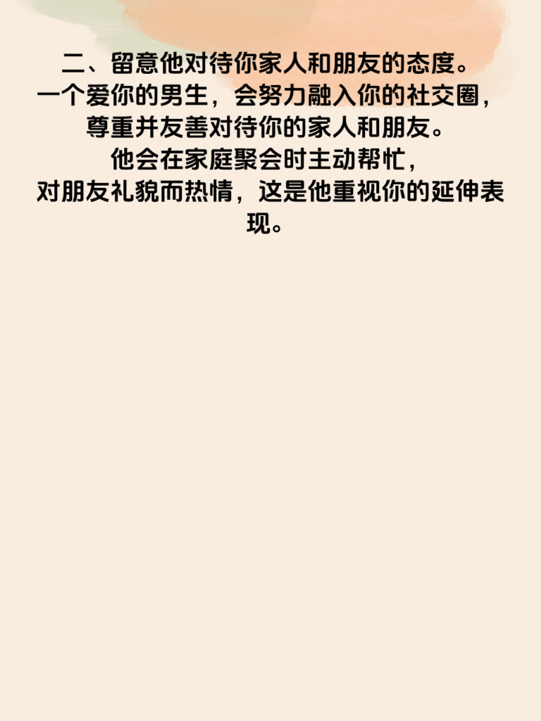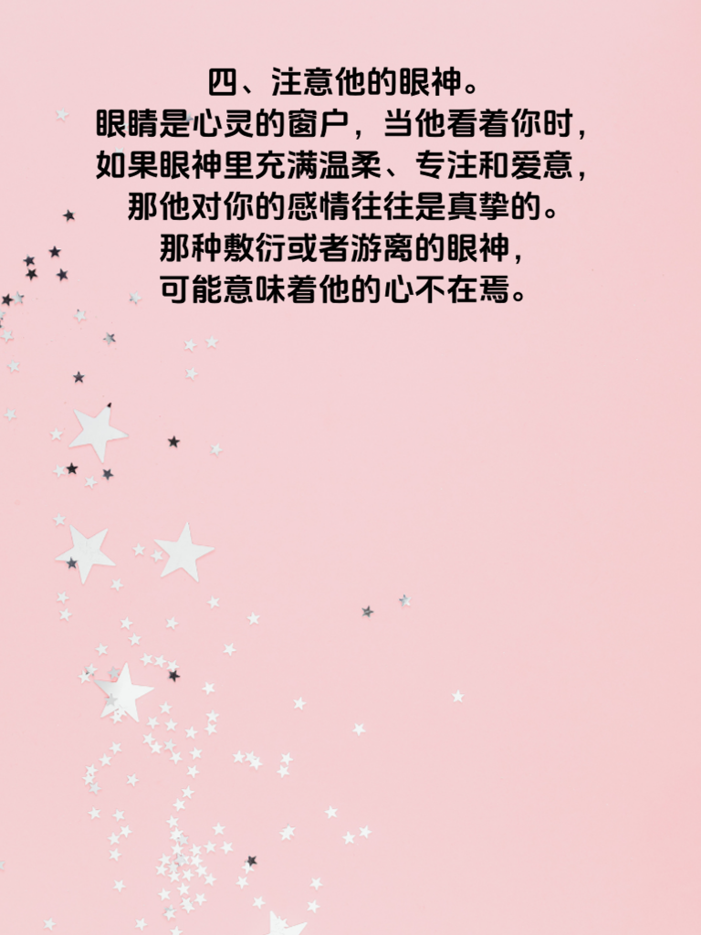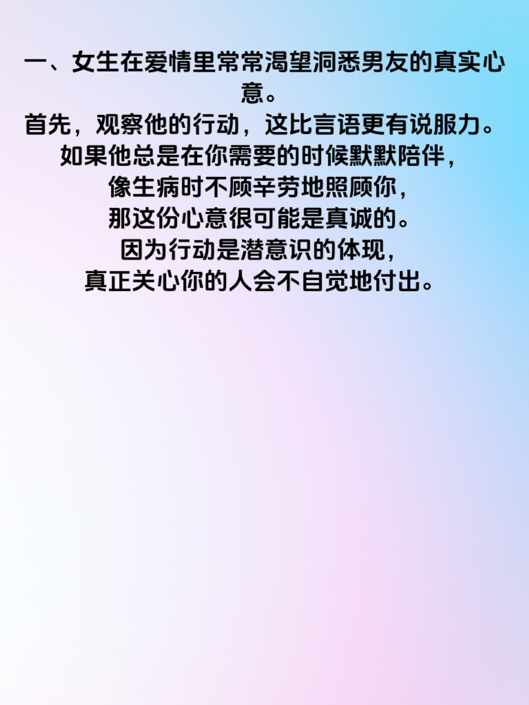 一、女生在爱情里常常渴望洞悉男友的真实心意。首先,观察他的行动,这比言语更有说服力。如果他总是在你需要的时候默默陪伴,像生病时不顾辛劳地照顾你,那这份心意很可能是真诚的。因为行动是潜意识的体现,真正关心你的人会不自觉地付出。 二、留意他对待你家人和朋友的态度。一个爱你的男生,会努力融入你的社交圈,尊重并友善对待你的家人和朋友。他会在家庭聚会时主动帮忙,对朋友礼貌而热情,这是他重视你的延伸表现。 三、看他是否愿意为你做出改变。人都有自己的习惯,但如果他为了让你开心,愿意克服自己的一些小毛病,例如戒烟或者减少玩游戏的时间,那他对你的心意是很深厚的。毕竟,只有在乎一个人,才会愿意为其改变自己。 四、注意他的眼神。眼睛是心灵的窗户,当他看着你时,如果眼神里充满温柔、专注和爱意,那他对你的感情往往是真挚的。那种敷衍或者游离的眼神,可能意味着他的心不在焉。