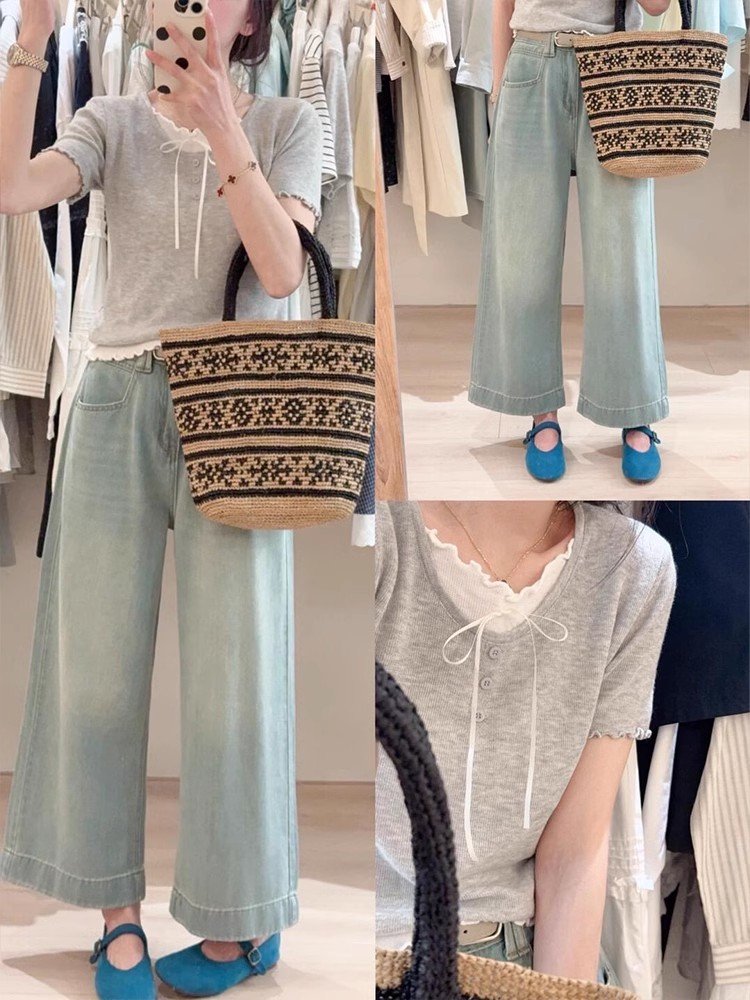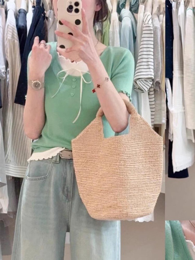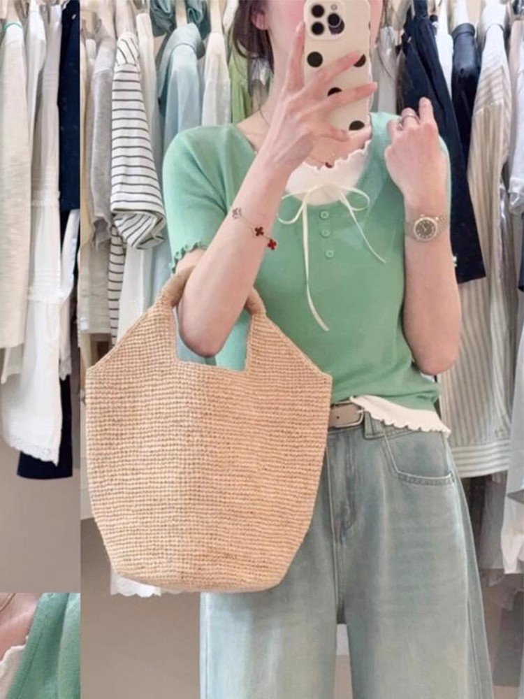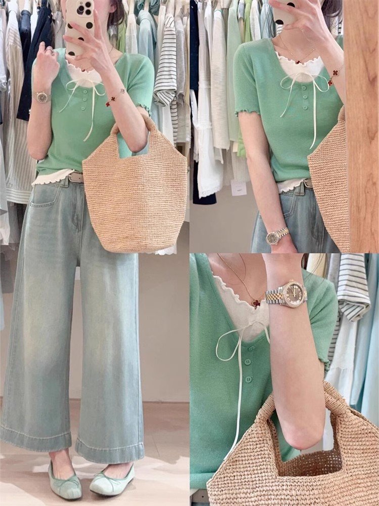 绿色木耳边v领假两件短袖正肩t恤女夏不规