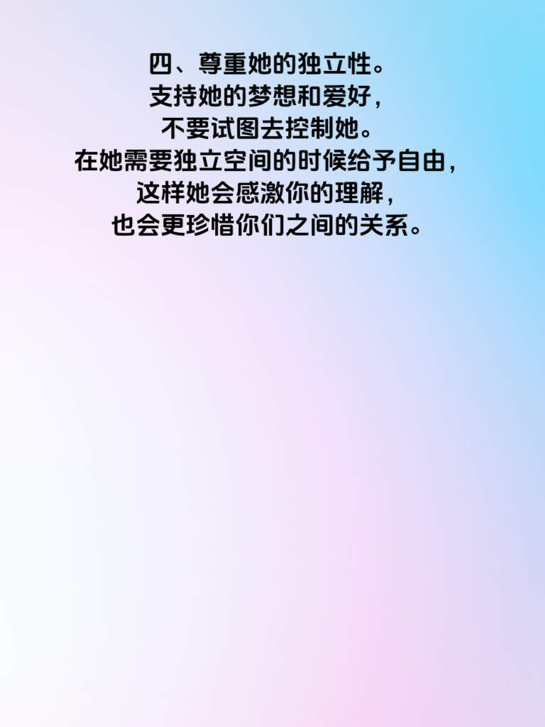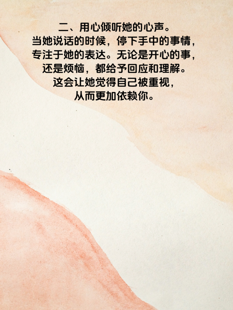 一、给予足够的安全感。女生在感情里往往需要安全感,这就要求男生坦诚相待,不隐瞒,不欺骗。比如每天简单汇报自己的行踪,不是限制自由,而是一种让她安心的方式。 二、用心倾听她的心声。当她说话的时候,停下手中的事情,专注于她的表达。无论是开心的事还是烦恼,都给予回应和理解。这会让她觉得自己被重视,从而更加依赖你。 三、制造小惊喜。不需要多么昂贵的礼物,偶尔的一束鲜花,一份她喜欢的小点心,都会让她感到开心。这些小惊喜会在平淡的生活中增添乐趣,也让她时刻期待和你在一起的时光。 四、尊重她的独立性。支持她的梦想和爱好,不要试图去控制她。在她需要独立空间的时候给予自由,这样她会感激你的理解,也会更珍惜你们之间的关系。 五、共同成长。两个人一起进步,一起学习新事物。可以一起参加兴趣班,或者共同制定健身计划等。在这个过程中,你们会有更多的话题,感情也会更加深厚,她自然就离不开你了。