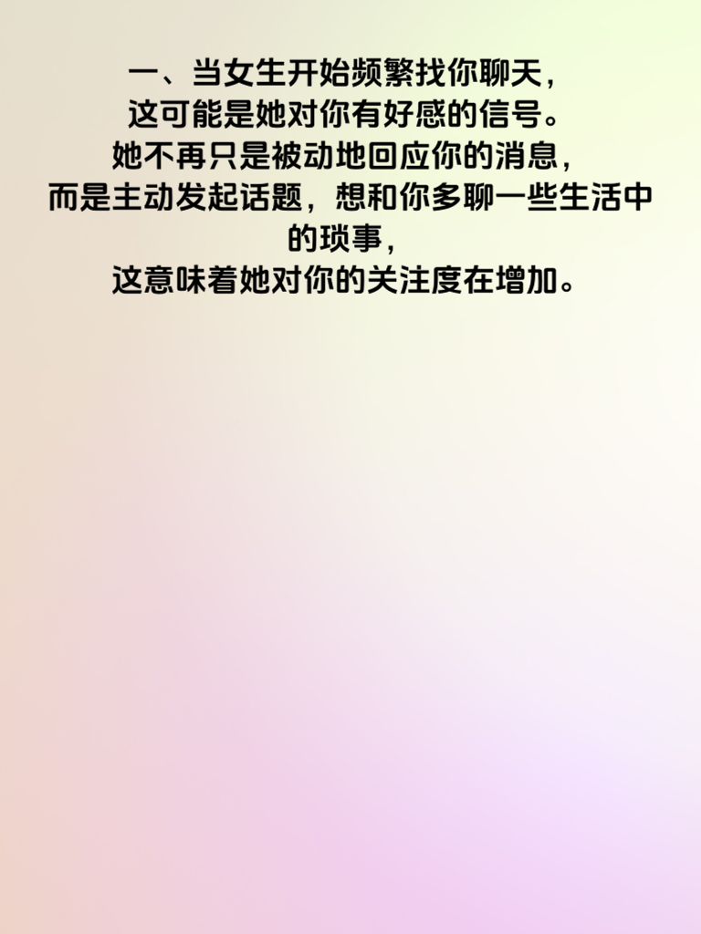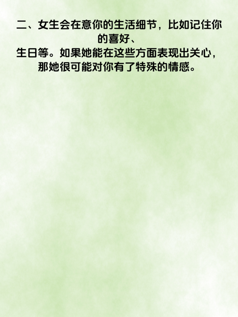 一、当女生开始频繁找你聊天,这可能是她对你有好感的信号。她不再只是被动地回应你的消息,而是主动发起话题,想和你多聊一些生活中的琐事,这意味着她对你的度在增加。 二、女生会在意你的生活细节,比如记住你的喜好、生日等。如果她能在这些方面表现出关心,那她很可能对你有了特殊的情感。 三、当女生在你面前变得紧张或者害羞时,这也是一个重要的信号。她可能会不自觉地摆弄头发、脸红等,这表明她对你有了不一样的感觉。 四、女生愿意为你付出时间和精力,比如陪你做一些你喜欢的事情,或者帮助你解决问题。这说明她在乎你,愿意在你身上花费时间