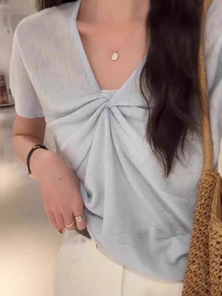 韩系白色扭结v领短袖正肩t恤女夏季小个子