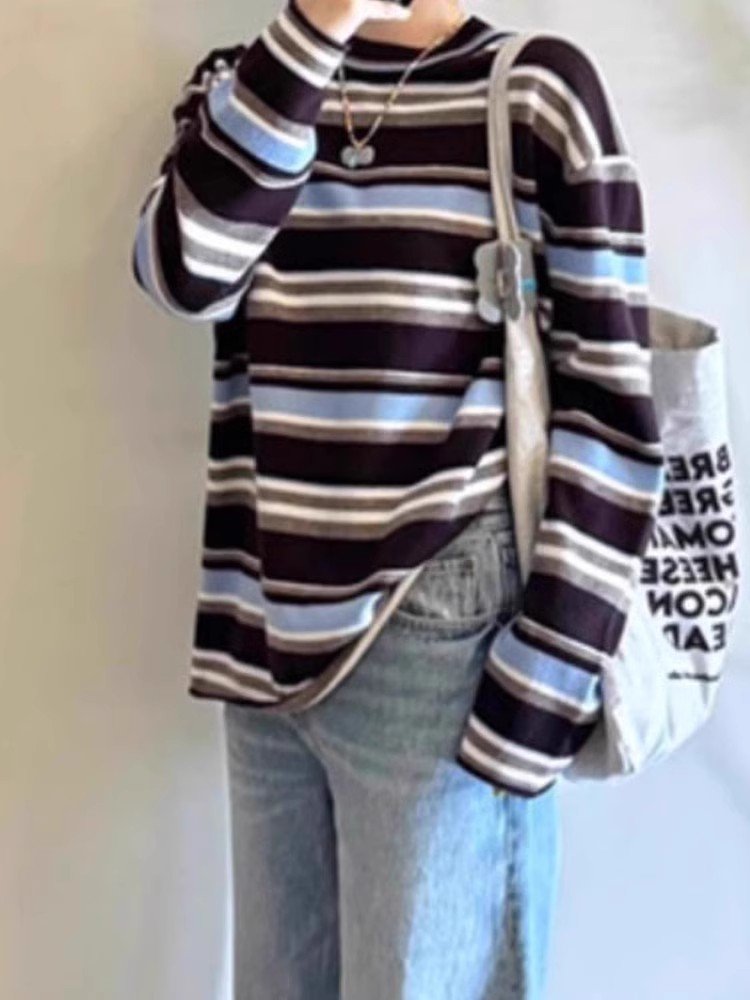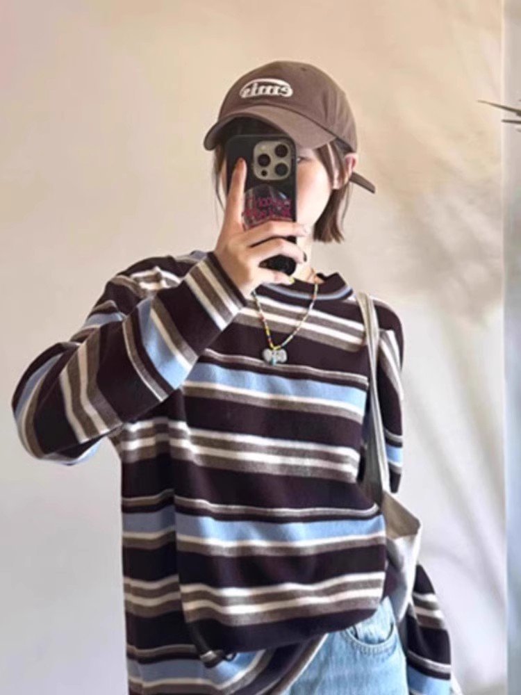 美式复古撞色条纹长袖正肩t恤女早春独特别