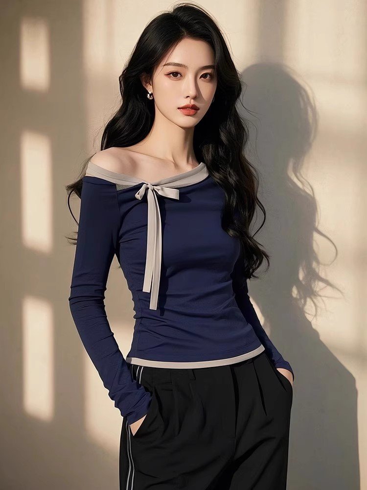 藏蓝色小心机斜肩长袖t恤打底衫女早春季小