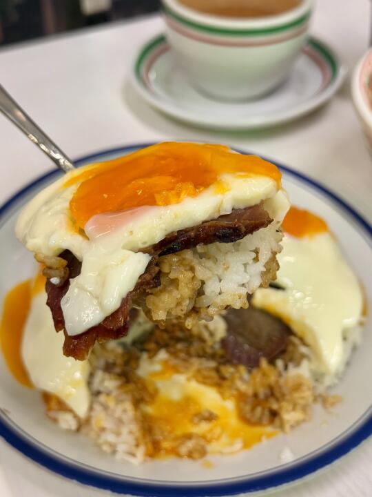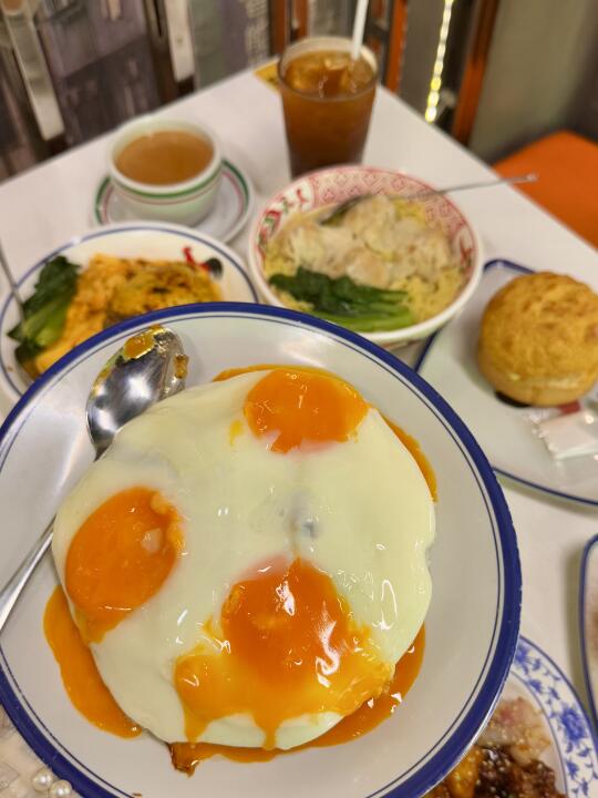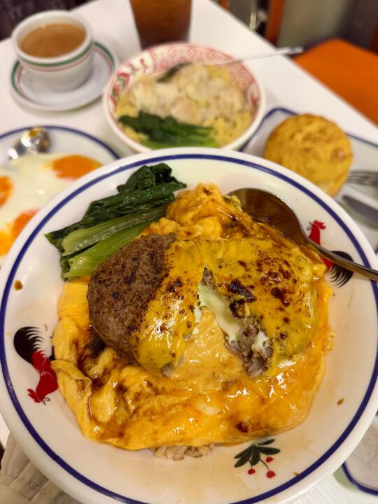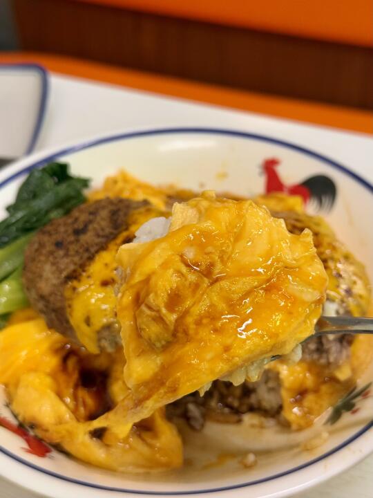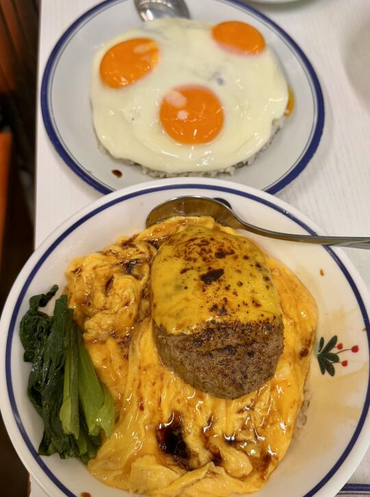 食运的新品!!好吃的飞起!! 人均几十r又能吃好又能吃饱 奶酪汉堡肉滑蛋饭✅ 厚厚的一块肉排内里还有奶酪芝士流心 表面还铺上一层厚厚的滑蛋 又香又下饭!!太爱了 后羿第七箭饭✅ 取名真的太有意思了哈哈 下面铺了满满的叉烧 上面是三个流心蛋 米饭爱好者爱不释手!!巨巨巨好吃😋