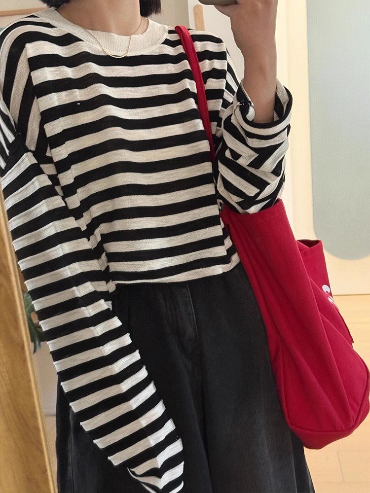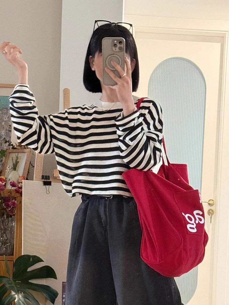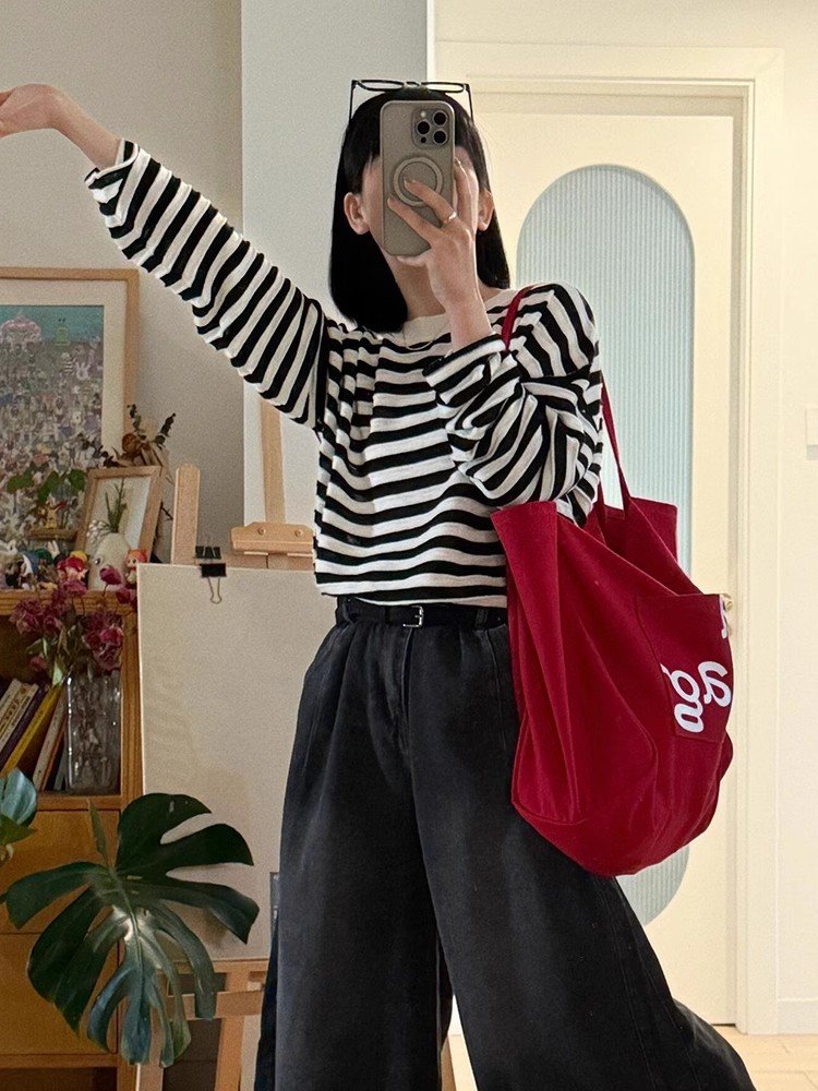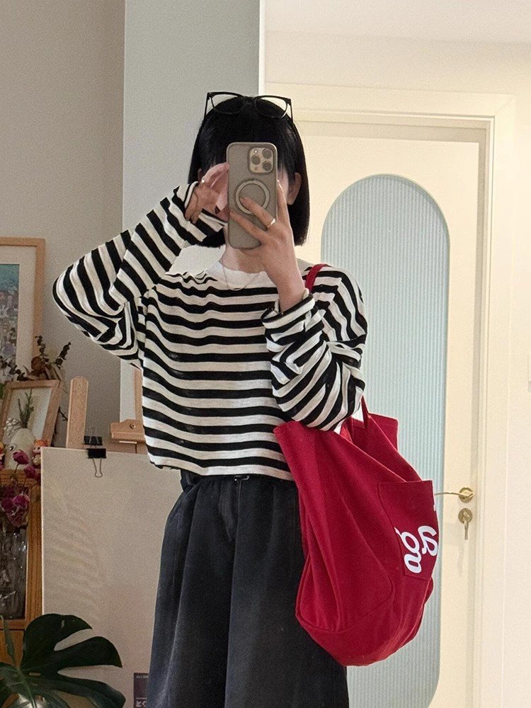 法式黑白条纹长袖正肩t恤女春秋季独特超好