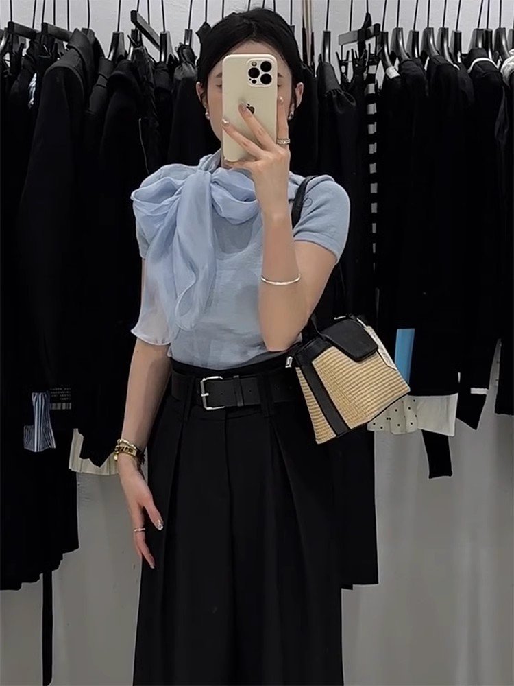 法式网纱拼接蝴蝶结蓝色针织冰丝短袖t恤女