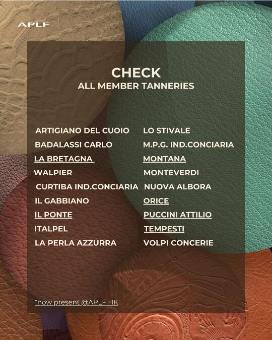 我们诚邀您莅临香港会议展览中心[搜索高亮]参与,与我们一同探索皮革行业的最新动态。我们成员鞣革厂多个展位将展示精湛的工艺与创新设计,期待与您深入交流,探讨合作机会。 📍香港会议展览中心: 展位信息如下: Il Ponte 3F-C02-IT La Bretagna 3F-D08-IT Montana 3F-C14-IT Orice 3F-D06-IT Puccini Attilio 3F-E06-IT Tempesti 3F-D07-IT 期待在展会上与您交流合作!