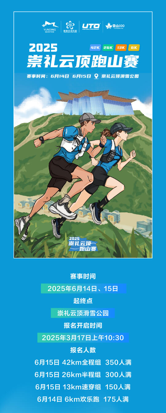 赛事时间:6.14-6.15 赛事地点:崇礼云顶滑雪场 赛事组别: 6月15日 42km全程组 6月15日 26km半程组 6月15日 13km 速穿组 6月14日 6km 欢乐跑 报名时间:3月17日上午10:30 参加团报优惠,请后台didi并留言报名公里数
