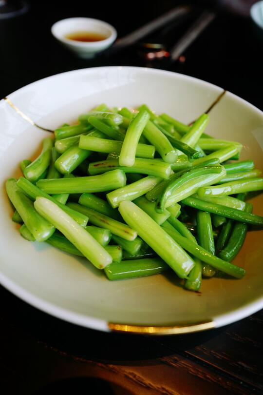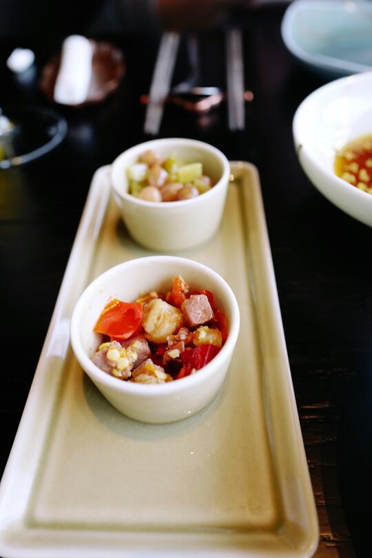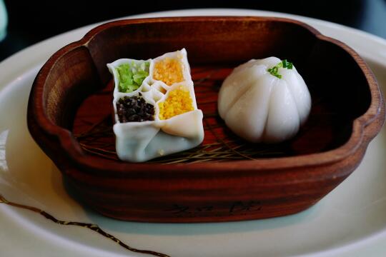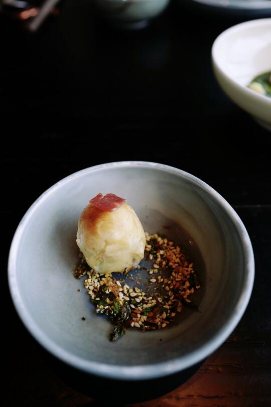 菜品从前菜就开始有巧思,青豆鱼丸是把鱼肉放在肉皮上剁,让鱼肉沾染肥肉香气,顺带烧伤点肥膘增加软嫩口感。七天的小豌豆粒是清口的,与鱼丸相得益彰。