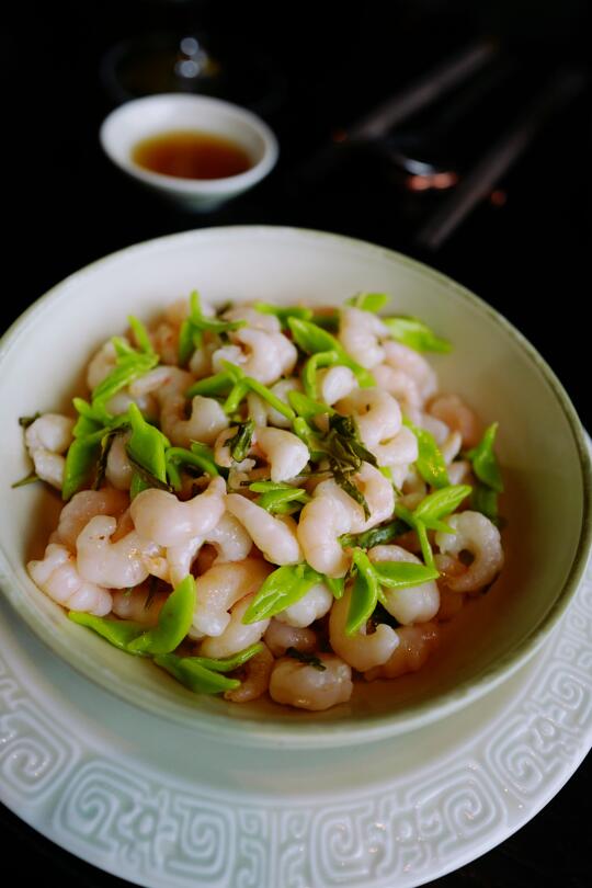 龙井虾仁里有两种茶叶,一种是用茶叶油捏是的面叶子,一种是真茶叶,这个面叶子一下子让传统的龙井虾仁变得与众不同。