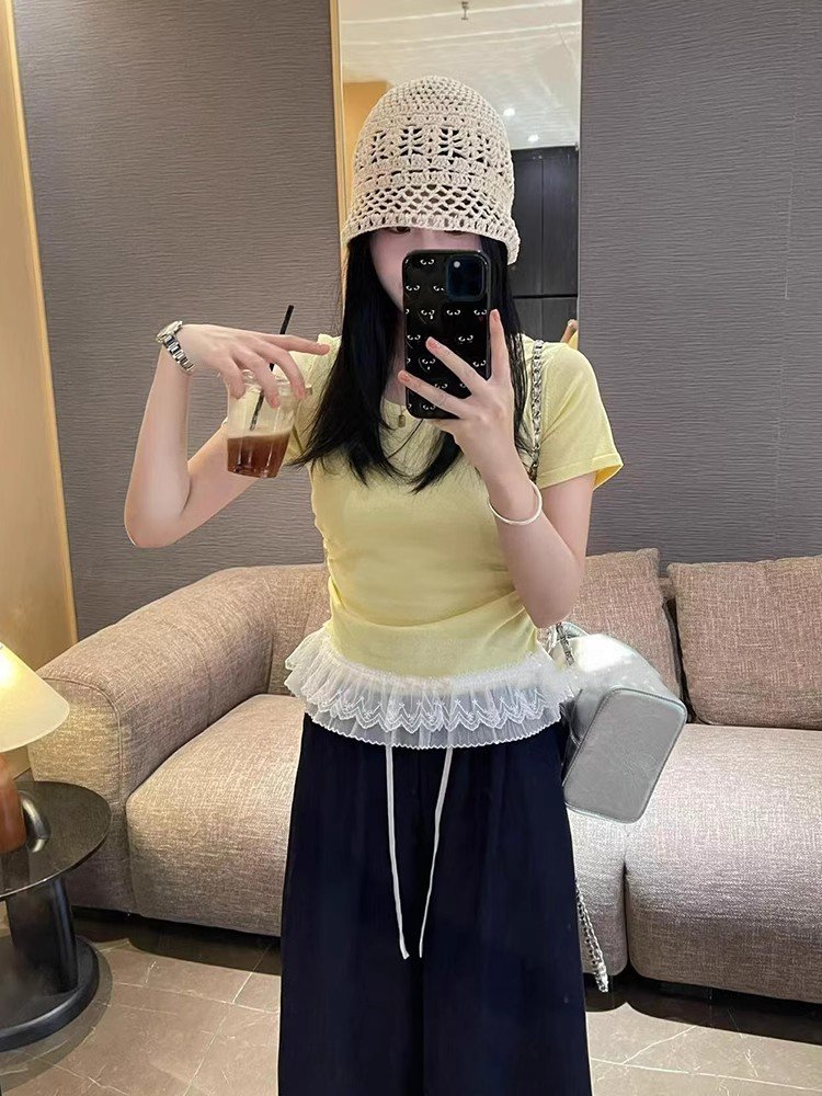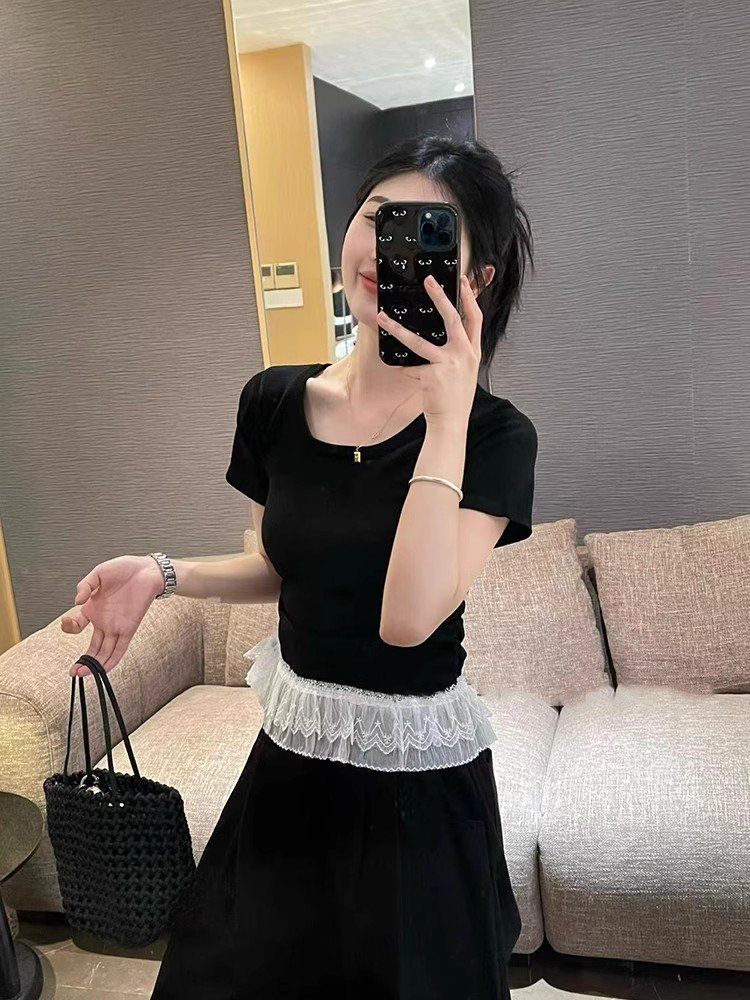 韩系藏蓝色短袖正肩t恤女夏夏季不规则蕾丝
