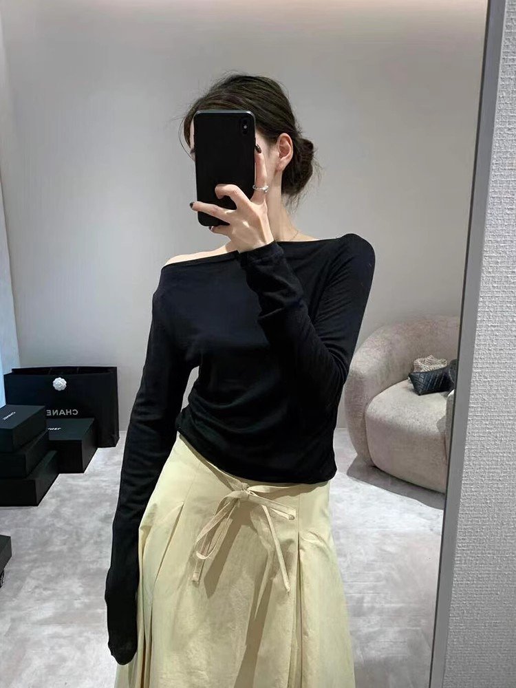 法式黑色一字肩修身内搭打底衫长袖t恤女春
