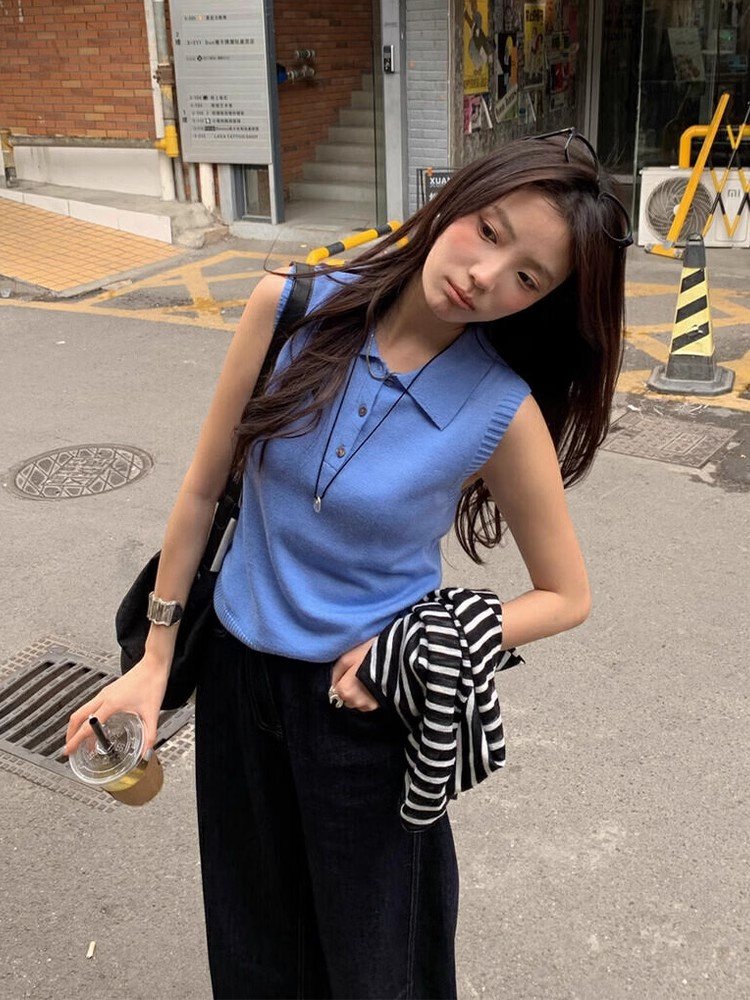法式蓝色冰丝polo领无袖坎肩针织短袖t