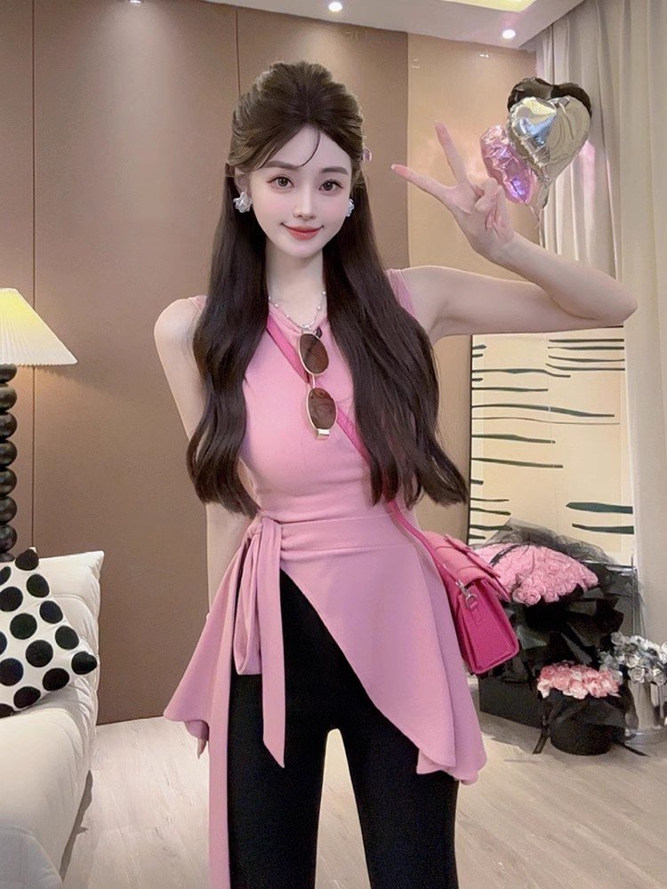 小个子粉色不规则飘带无袖背心坎肩上衣女夏