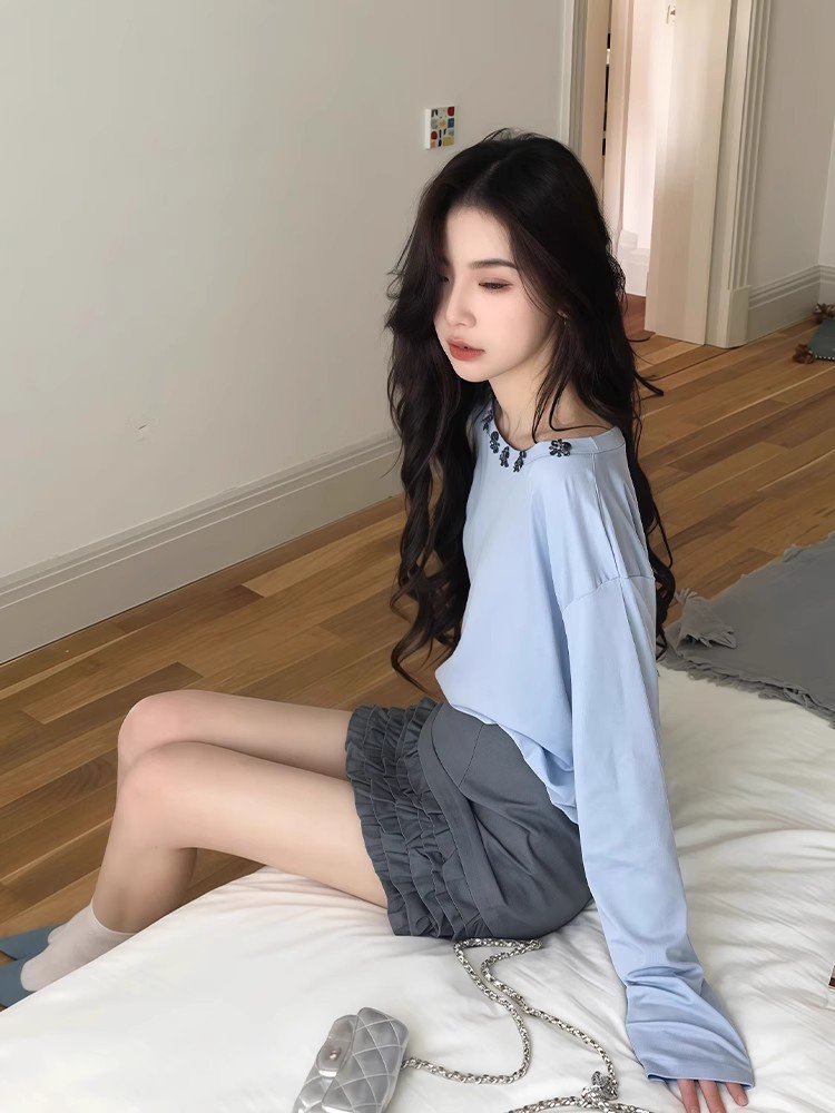 小个子蓝色花朵圆领防晒外搭罩衫上衣女夏季